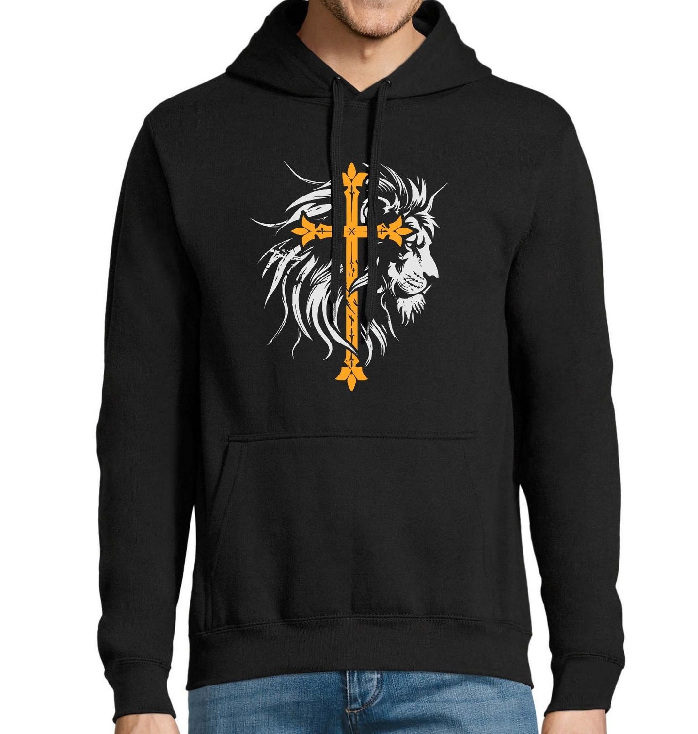 Pánská mikina Křesťanský Kříž a Lev z Judy. Tento působivý design spojuje majestátního lva s dominantním zlatým křížem – silný symbol křesťanství, odvahy a náboženství. Lev zde reprezentuje Ježíše Krista jako Lva z Judy, jak je popsán ve Zjevení 5:5, což odkazuje na jeho královský původ a moc.