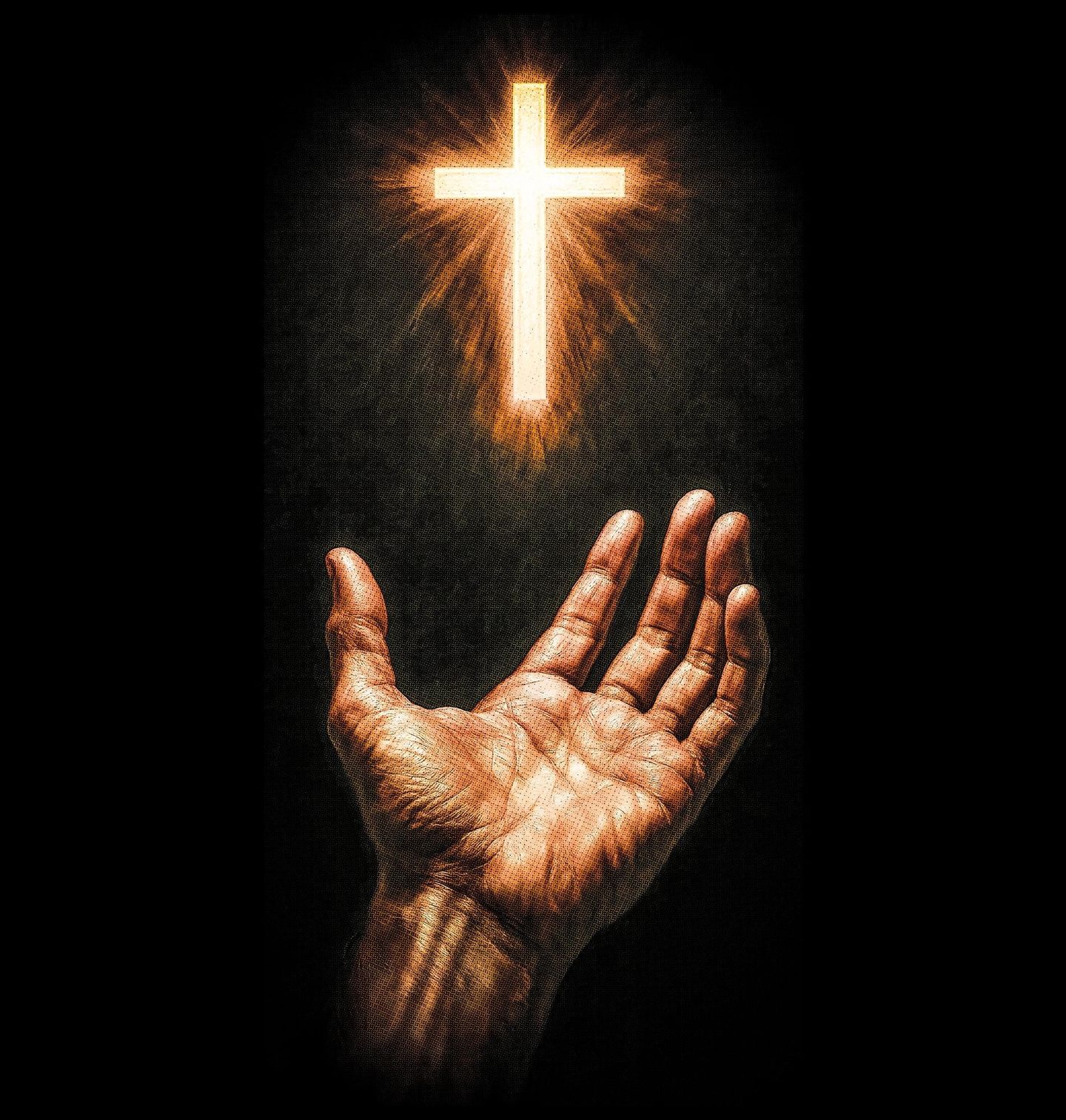 Dámské tričko Křesťanský Kříž na Dotek. Tento působivý motiv zachycuje otevřenou lidskou dlaň, nad níž září kříž jako symbol naděje, víry a božské přítomnosti. Světlo vycházející z kříže připomíná, že i v temnotě má člověk možnost obrátit se k víře a najít vnitřní klid. Motiv silně odkazuje na křesťanství a jeho základní poselství – důvěru, odevzdání a spojení člověka s Bohem.