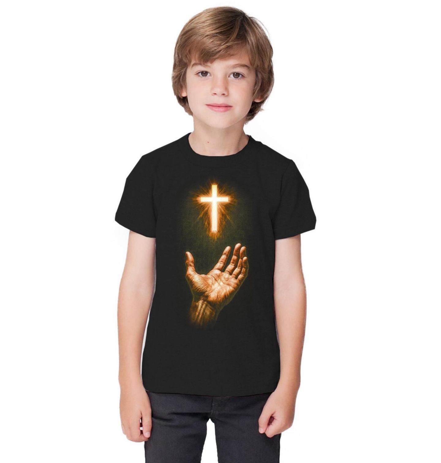 Dětské tričko Křesťanský Kříž na Dotek. Tento působivý motiv zachycuje otevřenou lidskou dlaň, nad níž září kříž jako symbol naděje, víry a božské přítomnosti. Světlo vycházející z kříže připomíná, že i v temnotě má člověk možnost obrátit se k víře a najít vnitřní klid. Motiv silně odkazuje na křesťanství a jeho základní poselství – důvěru, odevzdání a spojení člověka s Bohem.