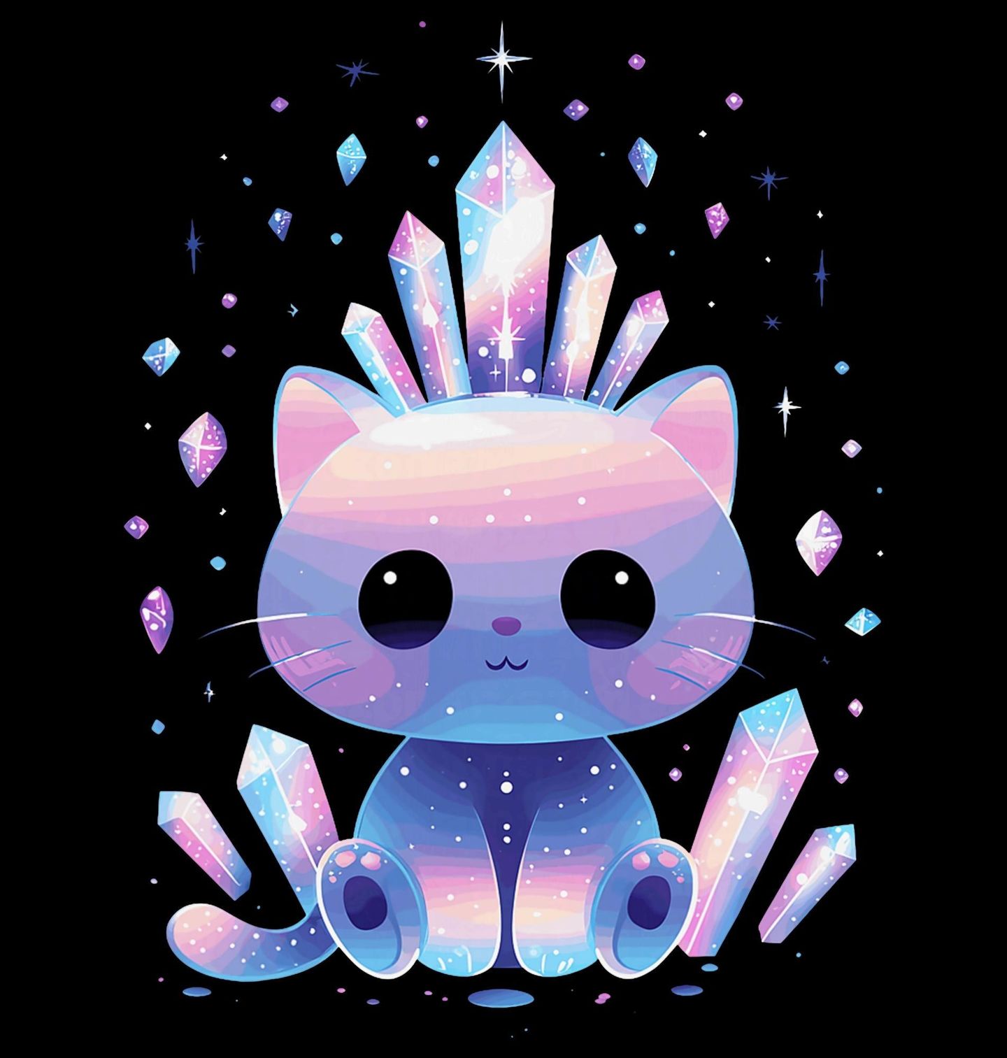 Dámské tričko Křišťálová Kočička. Na motivu je roztomilá pastelová kočka s velkýma očičkama, která sedí uprostřed zářících drahokamů. Z hlavy i kolem ní vyrůstá třpytivý krystal v různých barvách, takže celý design působí kouzelně, jemně a trochu pohádkově.