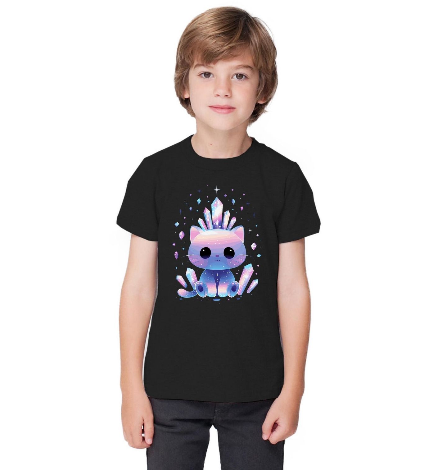 Dětské tričko Křišťálová Kočička. Na motivu je roztomilá pastelová kočka s velkýma očičkama, která sedí uprostřed zářících drahokamů. Z hlavy i kolem ní vyrůstá třpytivý krystal v různých barvách, takže celý design působí kouzelně, jemně a trochu pohádkově.