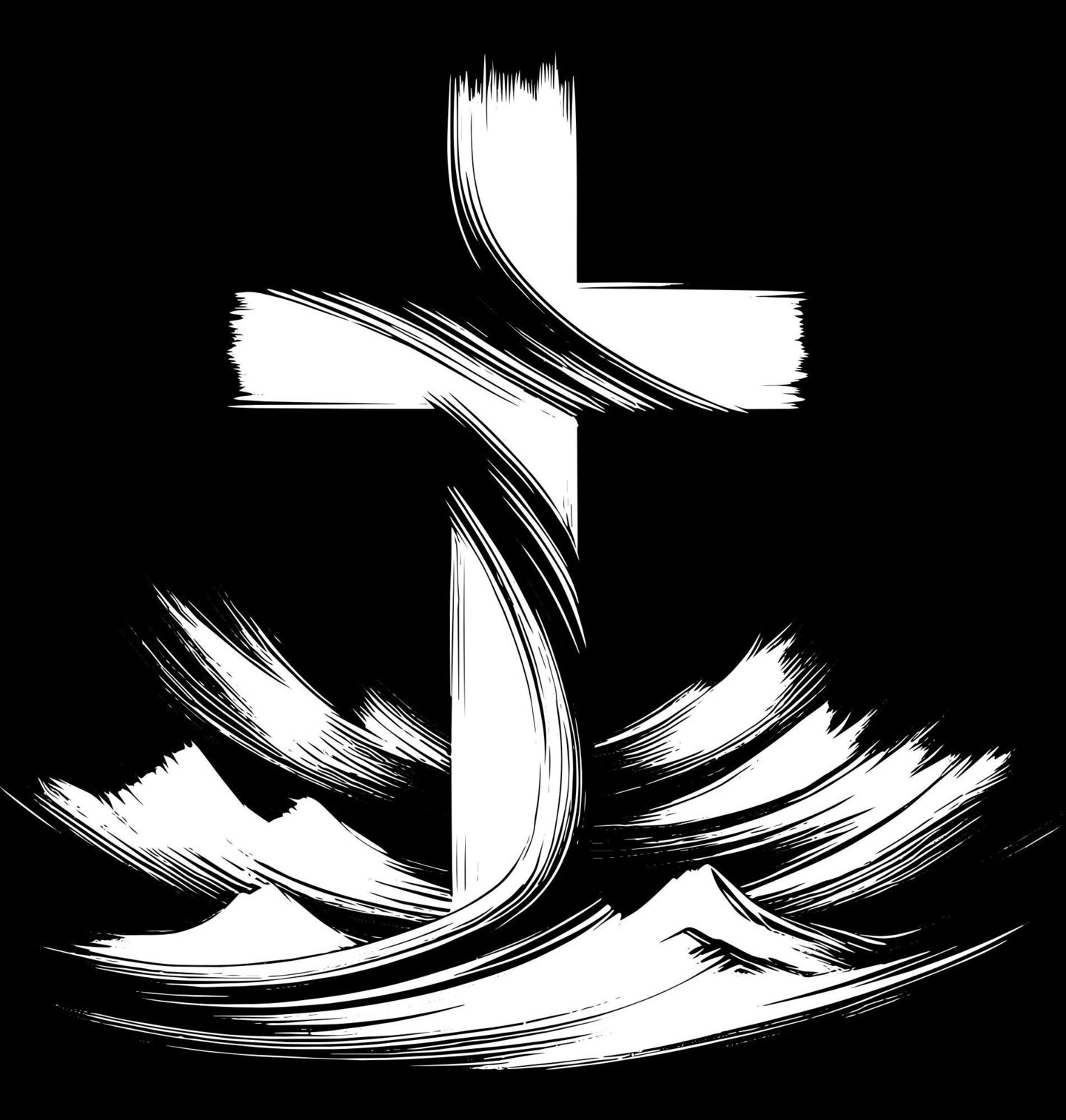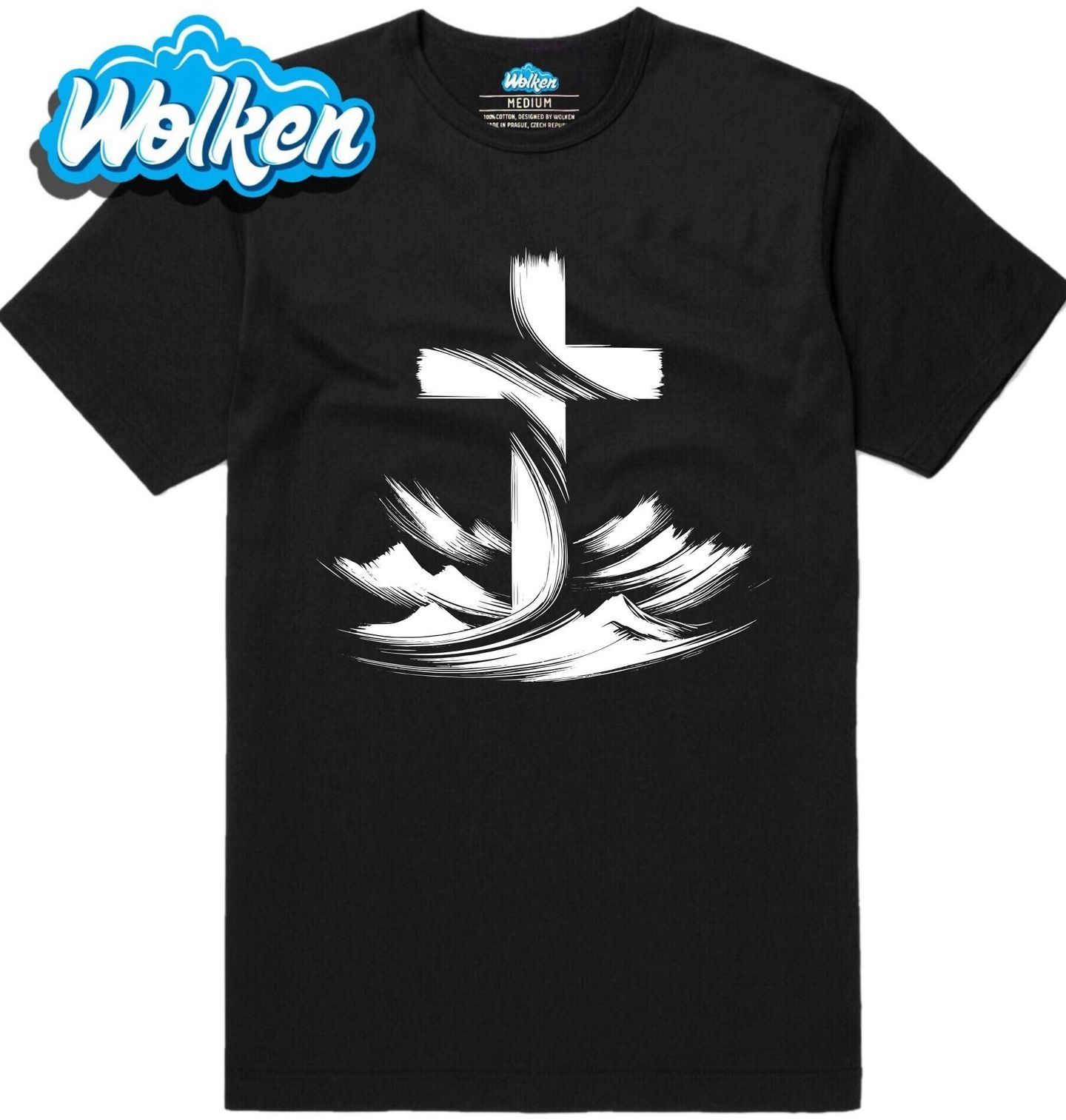Pánské tričko Kříž mezi Vlnami Života. Síla víry spojuje symbol kříže, majestátní hory a proudy připomínající cestu životem. Je dokonalým vyjádřením hluboké víry, vnitřní síly a naděje. Ideální pro ty, kdo nacházejí inspiraci v náboženství a chtějí nosit tento poselství s hrdostí.