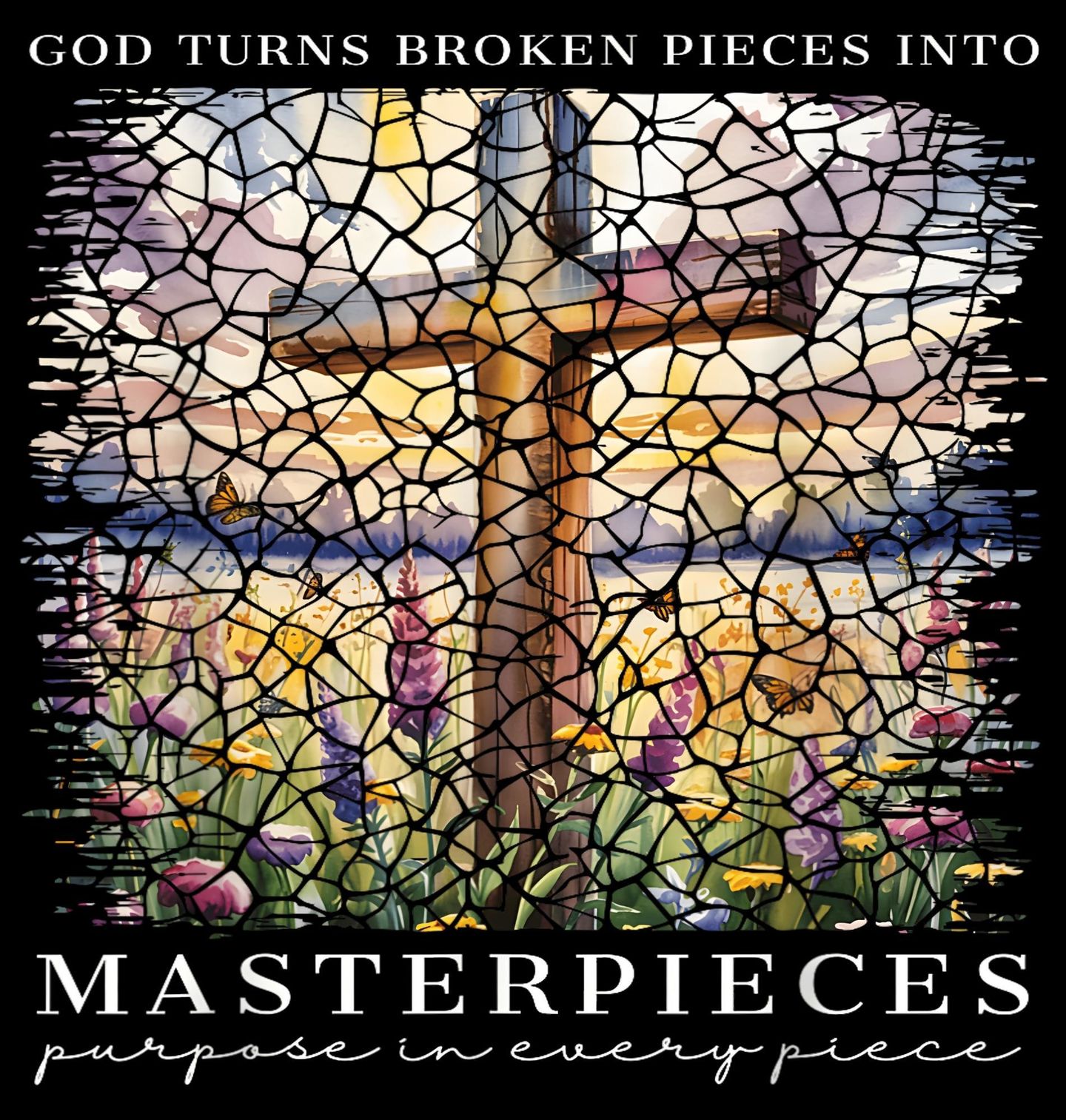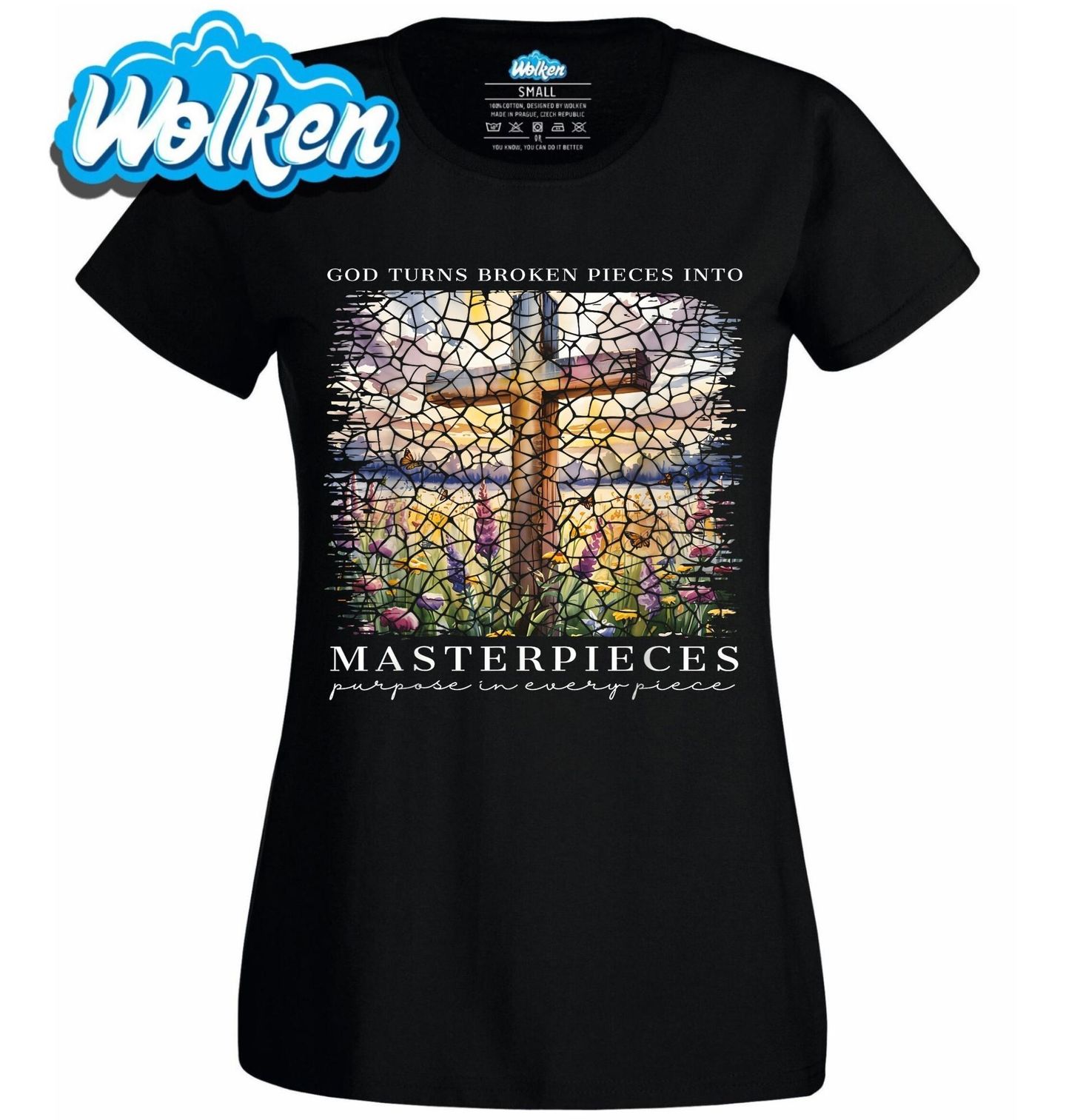 Dámské tričko Kříž v Mozaice Boží mistrovské dílo. „God turns broken pieces into“ a dole pokračování: „Masterpieces – purpose in every piece“. česky : „Bůh proměňuje rozbité kousky v mistrovská díla – smysl v každém kousku.“ Tento design připomíná, že Ježíš přináší naději, uzdravení a lásku. Je to nádherné umělecké ztvárnění, které vyjadřuje sílu náboženství a hodnoty křesťanství.
