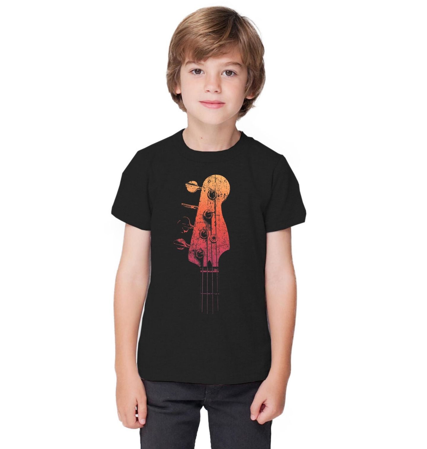 Dětské tričko Krk Kytary. Minimalistický, ale výrazný motiv zachycuje detail hlavy a krku elektrické kytara v retro barevném přechodu od žluté po červenou. Syrová textura a lehce vintage efekt dodávají designu autentickou atmosféru koncertního pódia a podtrhují energii, kterou přináší rock and roll.