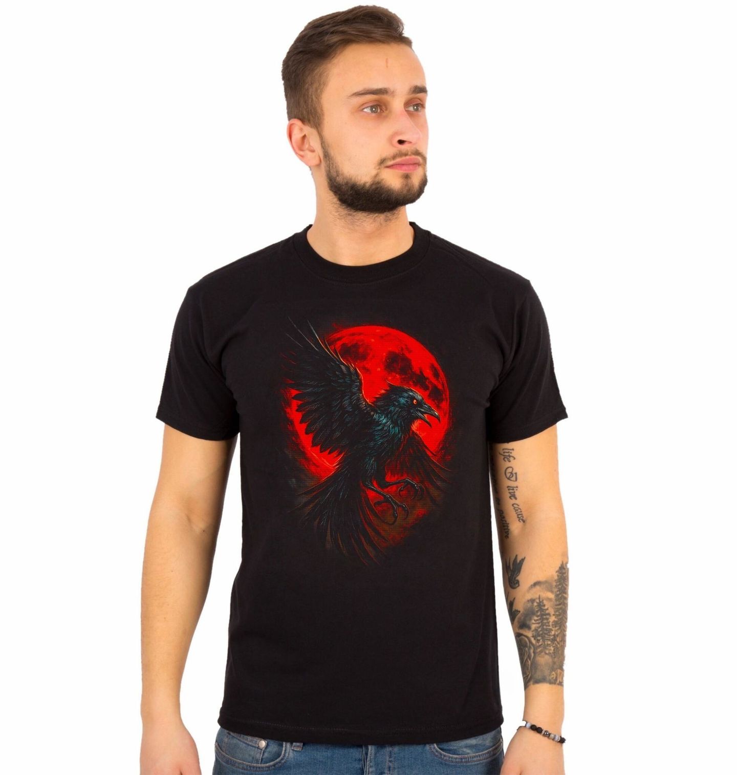 Pánské tričko Krkavec velký. Krkavec (Corvus corax), jeden z nejinteligentnějších a nejmystičtějších ptáků na světě. Silueta roztažených křídel před rudým měsícem vytváří dramatickou atmosféru, která okamžitě přitahuje pozornost. V mytologiích mnoha kultur byl považován za posla bohů, strážce hranice mezi světy a symbol hluboké moudrosti.