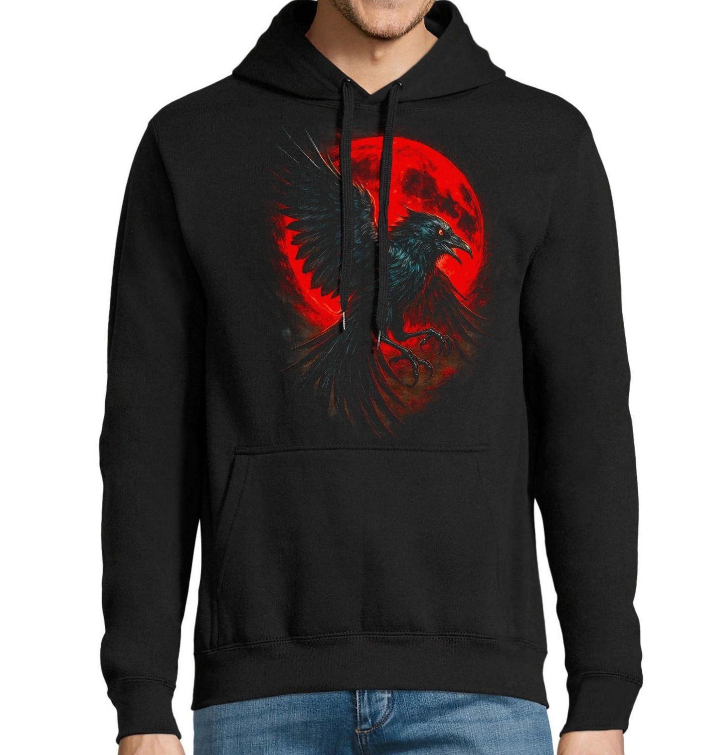Pánská mikina Krkavec velký. Krkavec (Corvus corax), jeden z nejinteligentnějších a nejmystičtějších ptáků na světě. Silueta roztažených křídel před rudým měsícem vytváří dramatickou atmosféru, která okamžitě přitahuje pozornost. V mytologiích mnoha kultur byl považován za posla bohů, strážce hranice mezi světy a symbol hluboké moudrosti.