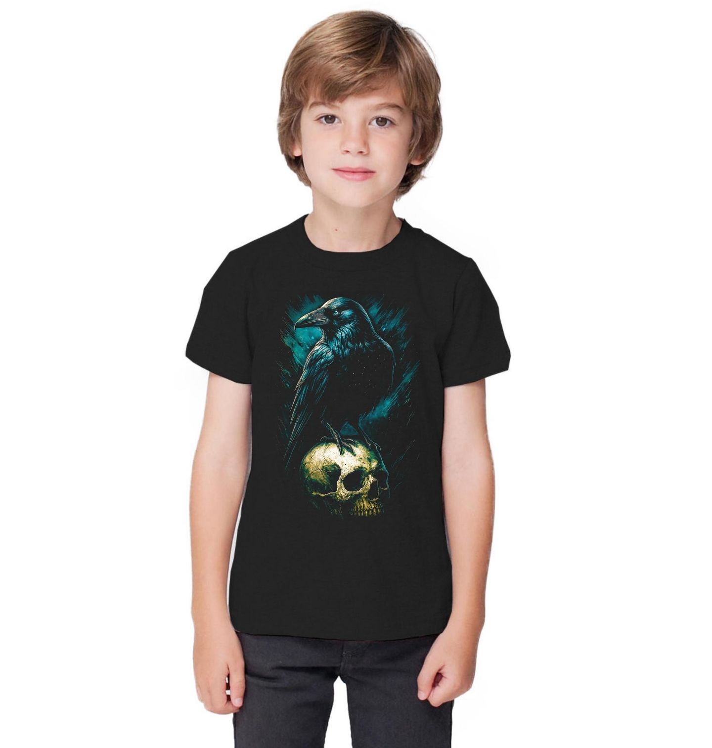 Dětské tričko Krkavec velký sedící na Lebce. Pták v této podobě působí dominantně, tajemně a nekompromisně, což z motivu činí ideální volbu pro milovníky gotiky, symbolismu, fantasy a temné estetiky. Lebka podtrhuje význam smrti jako přirozené součásti života a dodává celému obrazu silný vizuální i myšlenkový dopad.