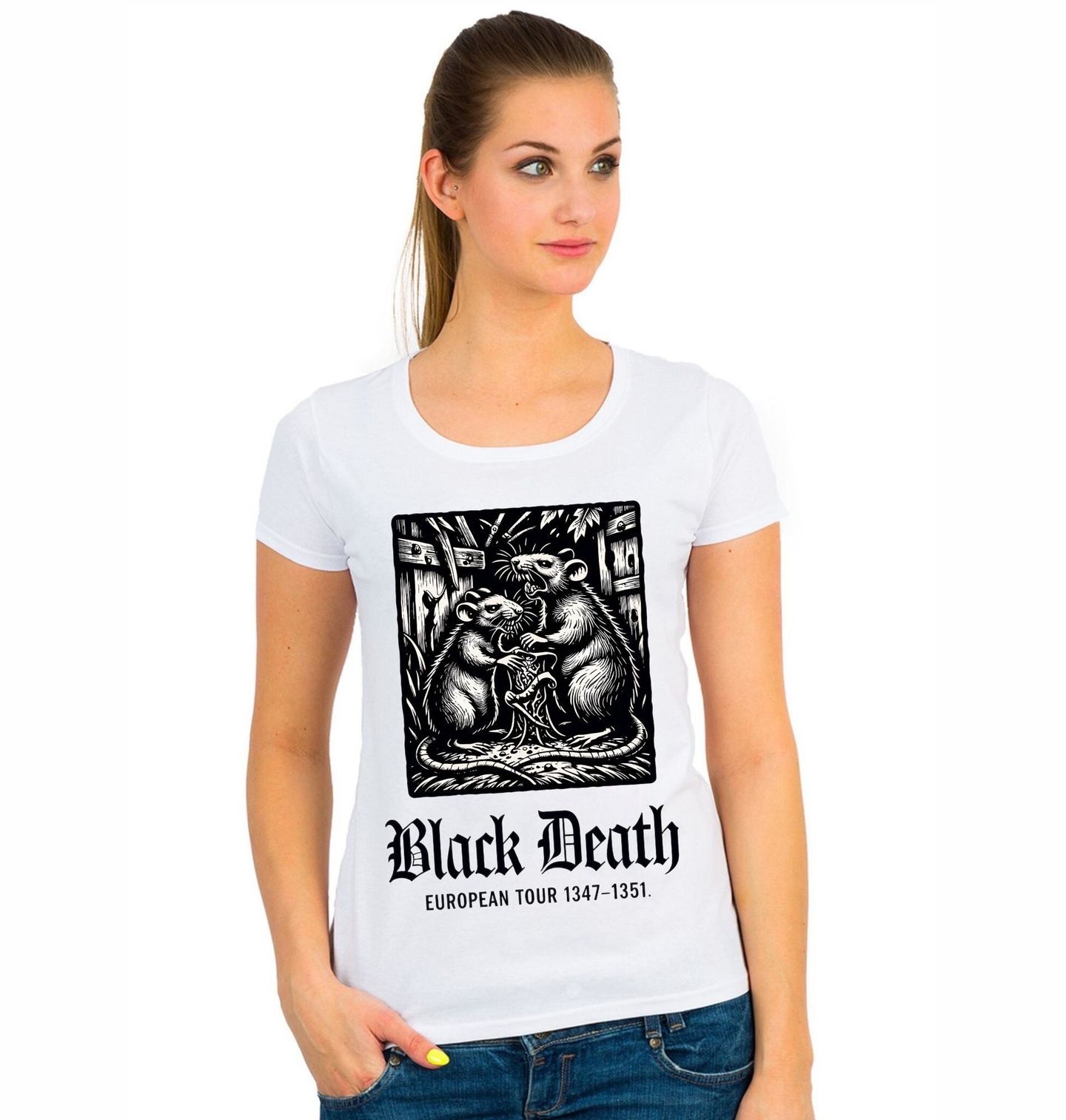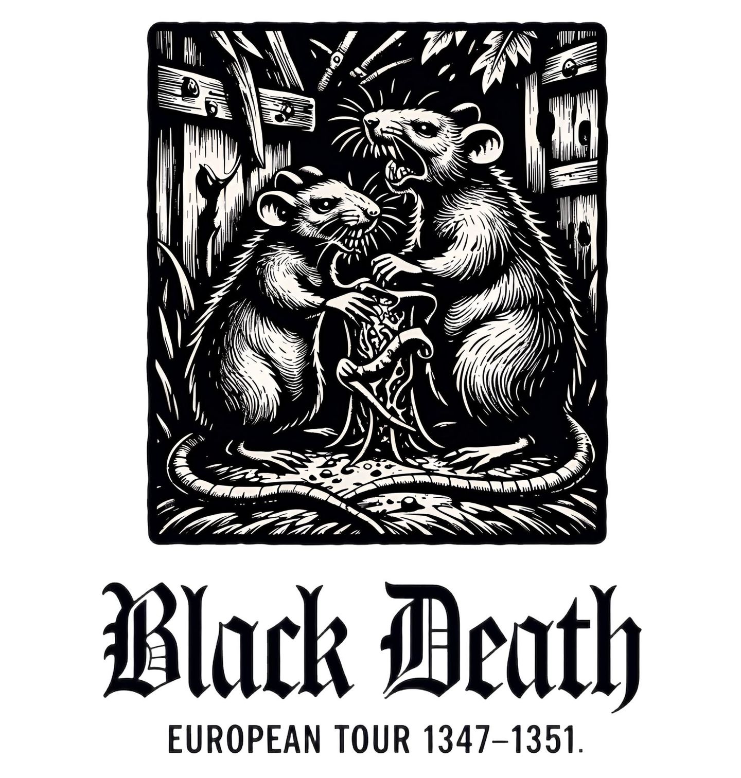 Dámské tričko Krysy a Černá smrt Morové turné Evropou. Motiv odkazuje na pandemii Černé smrti (Black Death), která v letech 1347–1351 zasáhla Evropu a vyžádala si miliony obětí. Krysy – tichí poslové zkázy – zde ožívají v syrové, dřevořezové stylizaci, která připomíná středověkou Evropu v době, kdy mor pustošil města i vesnice. Nápis „European Tour 1347–1351“ ironicky převádí historickou tragédii do podoby neúprosného „turné“, jež zasáhlo celý kontinent.