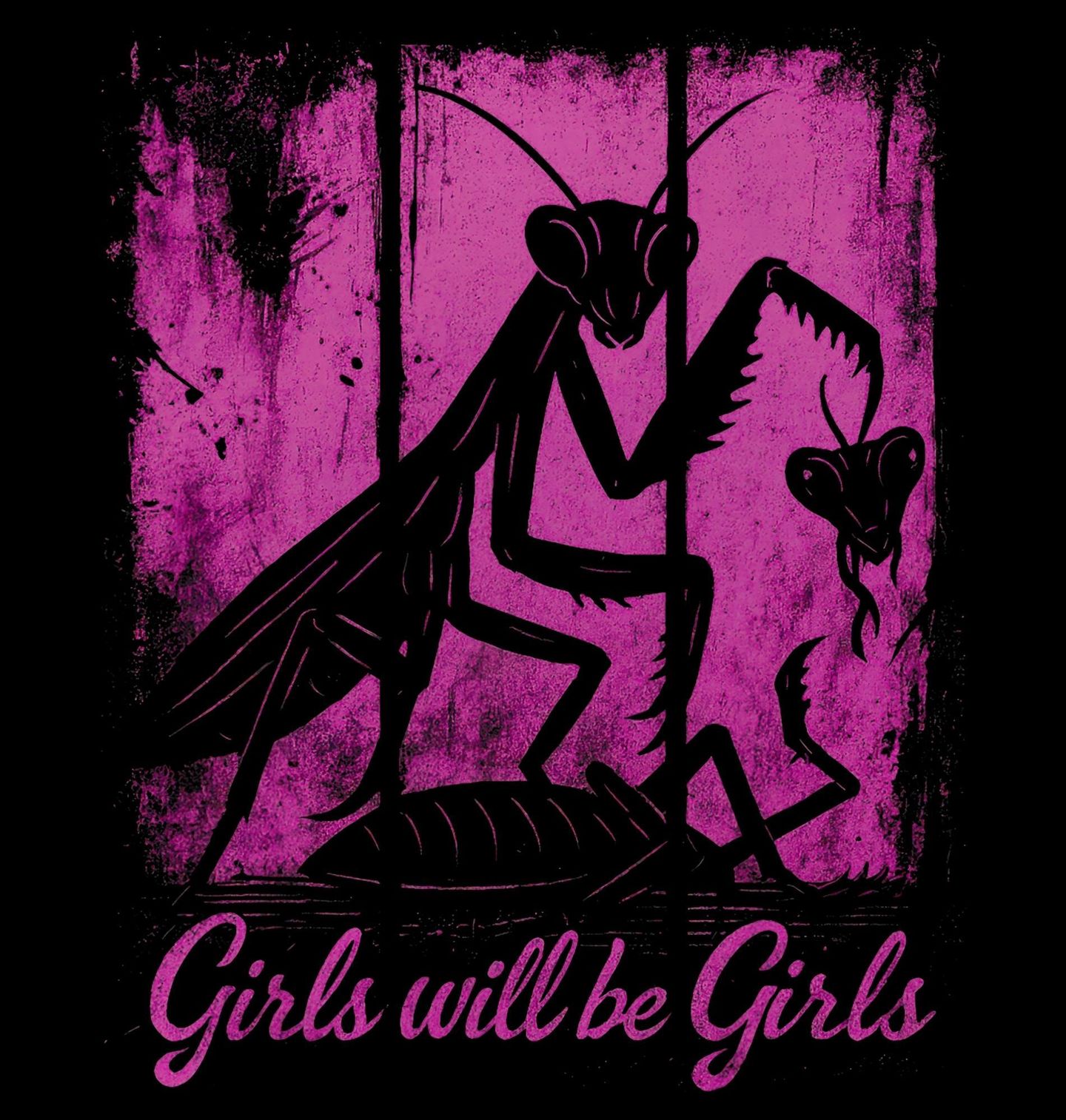 Dámské tričko Kudlanka nábožná Girls Will Be Girls. Tento originální motiv s dominantní kudlankou nábožnou a nápisem „Girls will be Girls“ mluví jasně – krásná na pohled, smrtící v akci. V přírodě je to právě kudlanka, která po páření často zabíjí svého samce, a právě tahle temná realita inspirovala ikonický, sarkastický design.