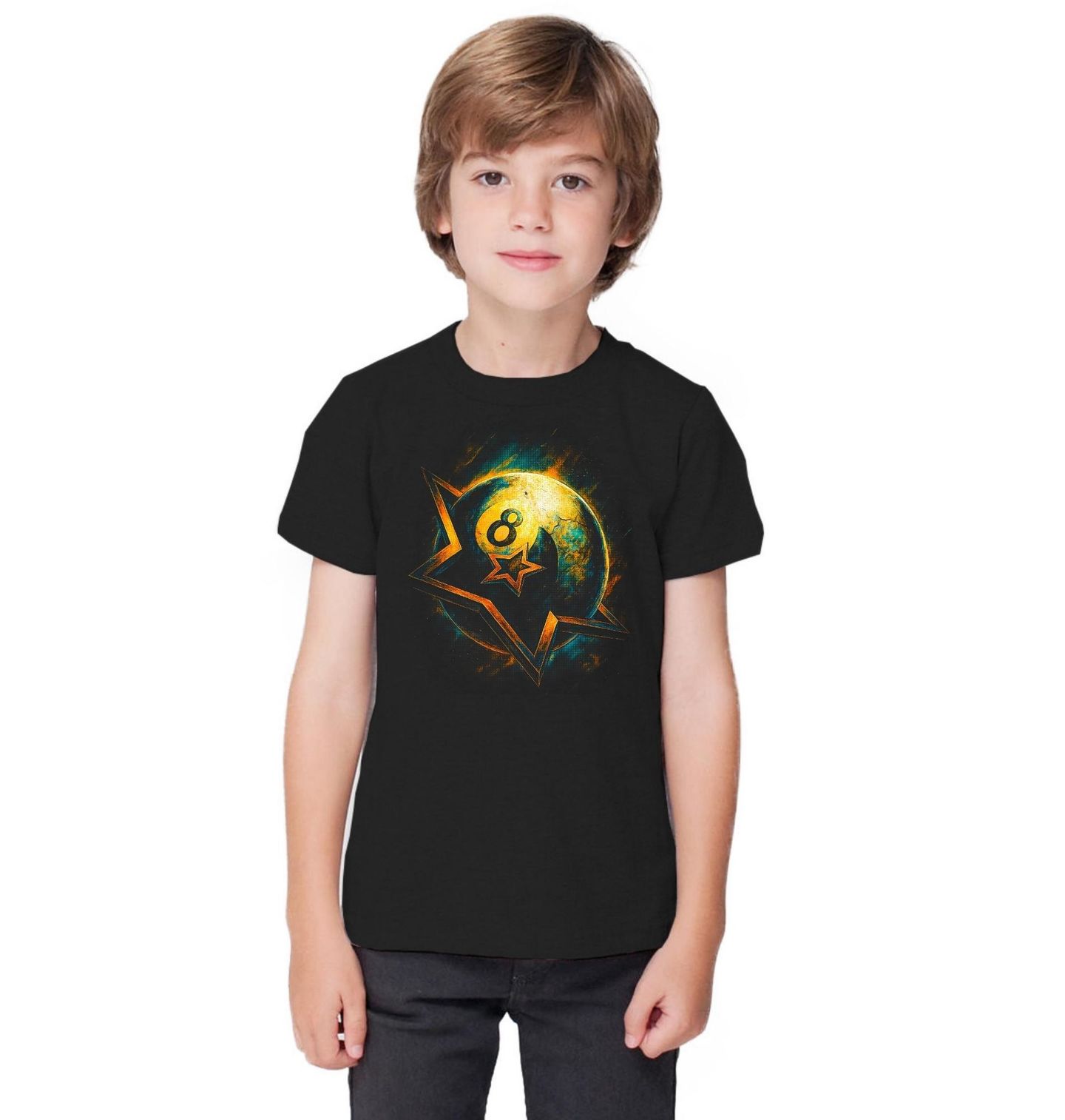 Dětské tričko Kulečníková Osmička Osudu. Styl, přesnost a hra nervů. Tento originální motiv spojuje svět kulečník s moderním, téměř kosmickým designem, kde dominuje ikonická osmička zasazená do dynamického a energického vizuálu. Ostré linie a výrazné barvy dodávají motivu sílu a jedinečný charakter. Kulečník zde není jen hra, ale symbol strategie, soustředění a kontroly nad každým tahem. Design působí moderně, lehce futuristicky a perfektně zapadne do streetwear stylu.
