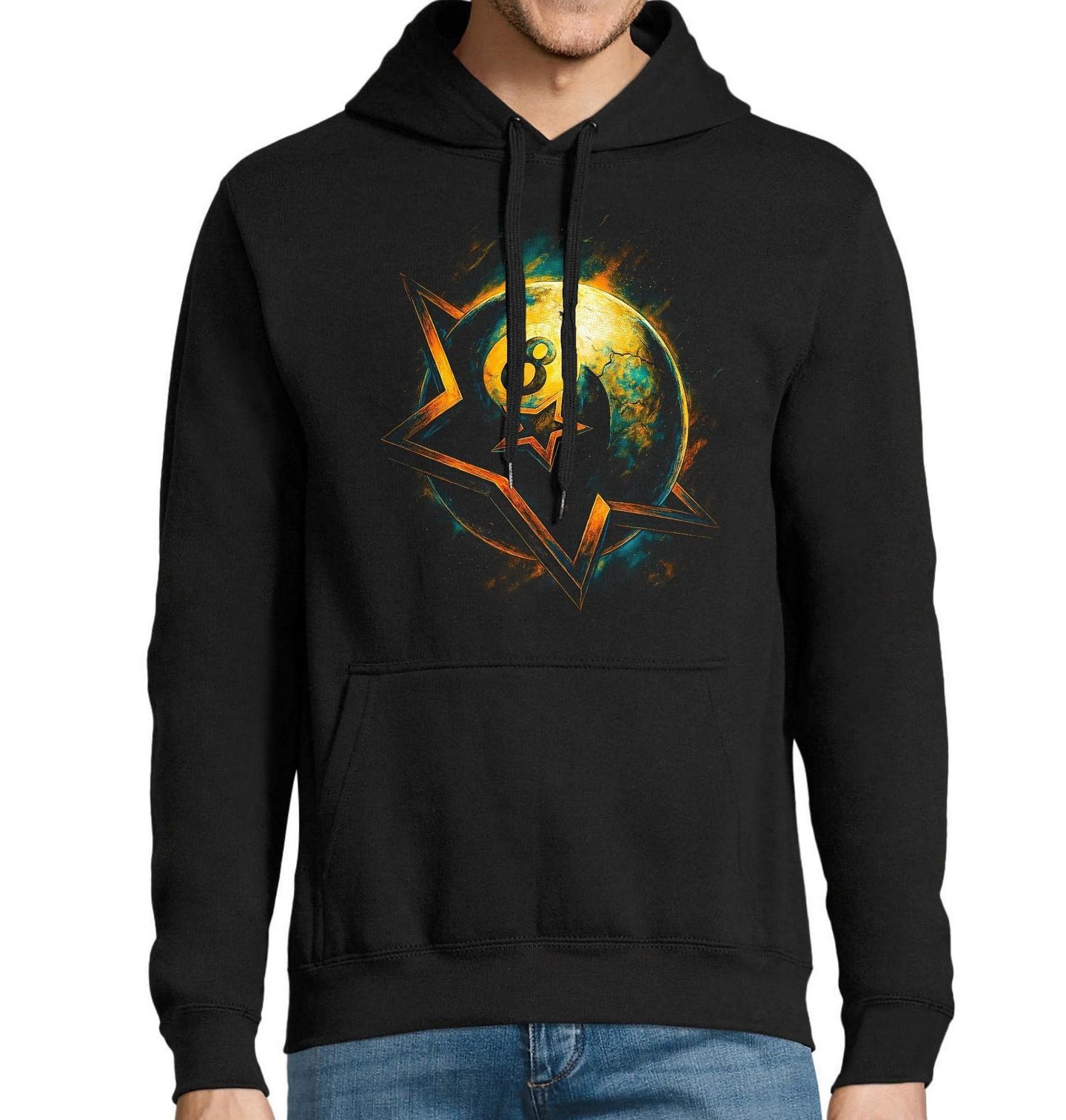 Pánská mikina Kulečníková Osmička Osudu. Styl, přesnost a hra nervů. Tento originální motiv spojuje svět kulečník s moderním, téměř kosmickým designem, kde dominuje ikonická osmička zasazená do dynamického a energického vizuálu. Ostré linie a výrazné barvy dodávají motivu sílu a jedinečný charakter. Kulečník zde není jen hra, ale symbol strategie, soustředění a kontroly nad každým tahem. Design působí moderně, lehce futuristicky a perfektně zapadne do streetwear stylu.