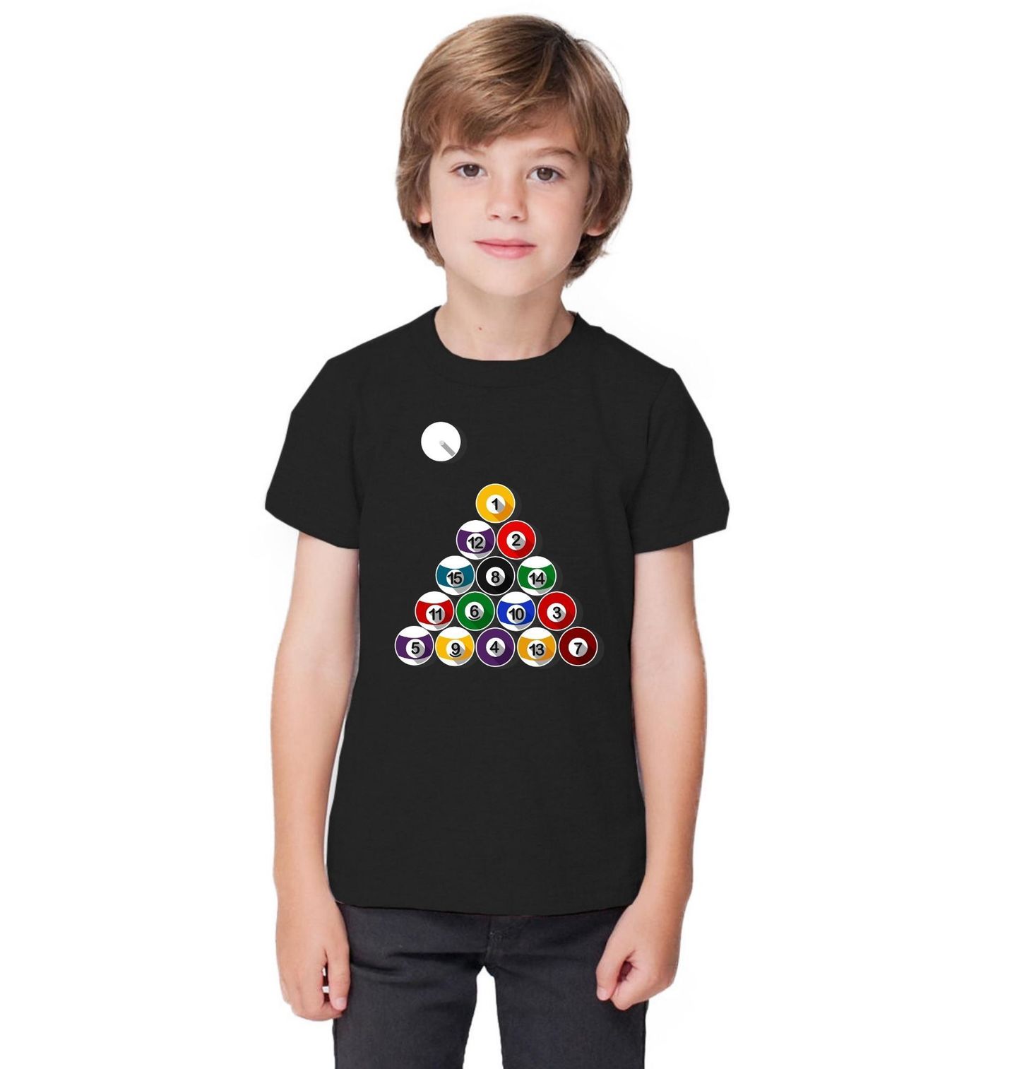 Dětské tričko Kulečníková Pyramida 8-Ball Osmička. Tento motiv zachycuje kulečník 8-Ball (Eight Ball), neboli Osmička - jde o nejrozšířenější disciplínu pool kulečníku, hraje se s 15 barevnými koulemi + bílá tágoová, cílem je potopit všechny své koule a nakonec černou 8. Ideální motiv pro všechny, kdo mají kulečník v krvi – ať už hrají rekreačně, soutěžně, nebo si jen užívají nadčasovou estetiku billiardu.