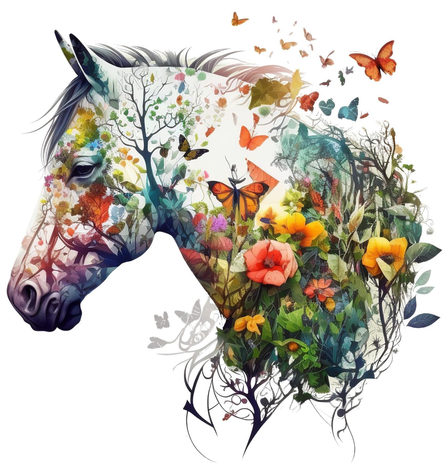 Dámské tričko Kůň v Jarní Zahradě. Originální umělecký motiv spojuje přírodu, barvy a fantazii do jednoho harmonického celku. Dominantní kůň je vytvořen z jemných linií a přírodních prvků, které doplňují pestré květiny, motýli a listy. Design působí lehce, snově a zároveň velmi moderně, takže zaujme každého milovníka přírody i zvířat.