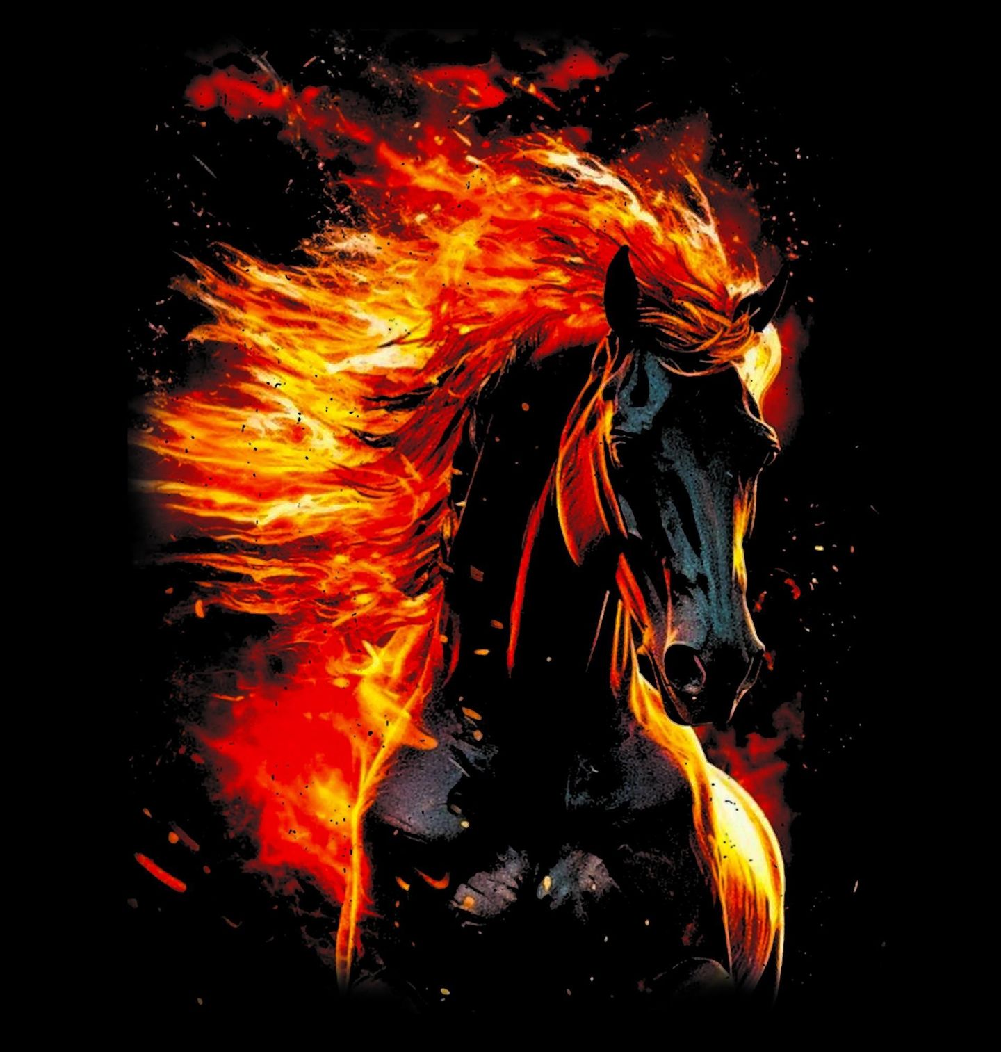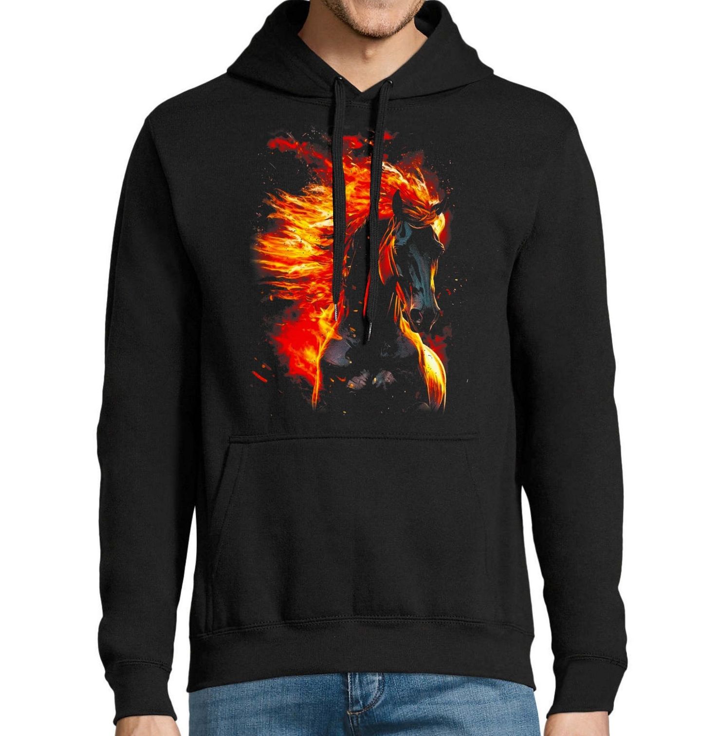 Pánská mikina Kůň v Plamenech. Dynamický design zachycuje siluetu koně zahalenou v plamenech, což symbolizuje nespoutanost, sílu a vášeň. Ideální pro ty, kteří chtějí vyjádřit energii a odvahu jít vlastní cestou.