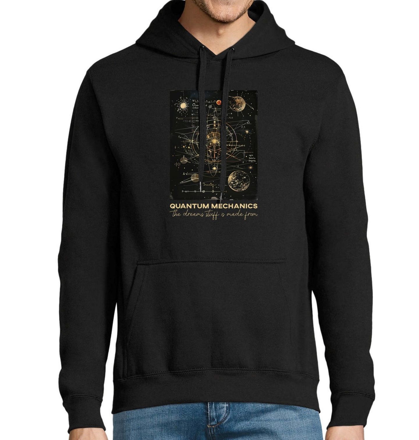 Pánská mikina Kvantová Mechanika. "QUANTUM MECHANICS – the dreams stuff is made from" (Kvantová mechanika – z čeho jsou sny tvořeny). Motiv zobrazuje detailní orbitální dráhy, hvězdy, planety a matematické vzorce inspirované kvantovou mechanikou. Ideální pro milovníky vědy, astronomie a fyziky, kteří chtějí ukázat svou vášeň pro objevování vesmíru.