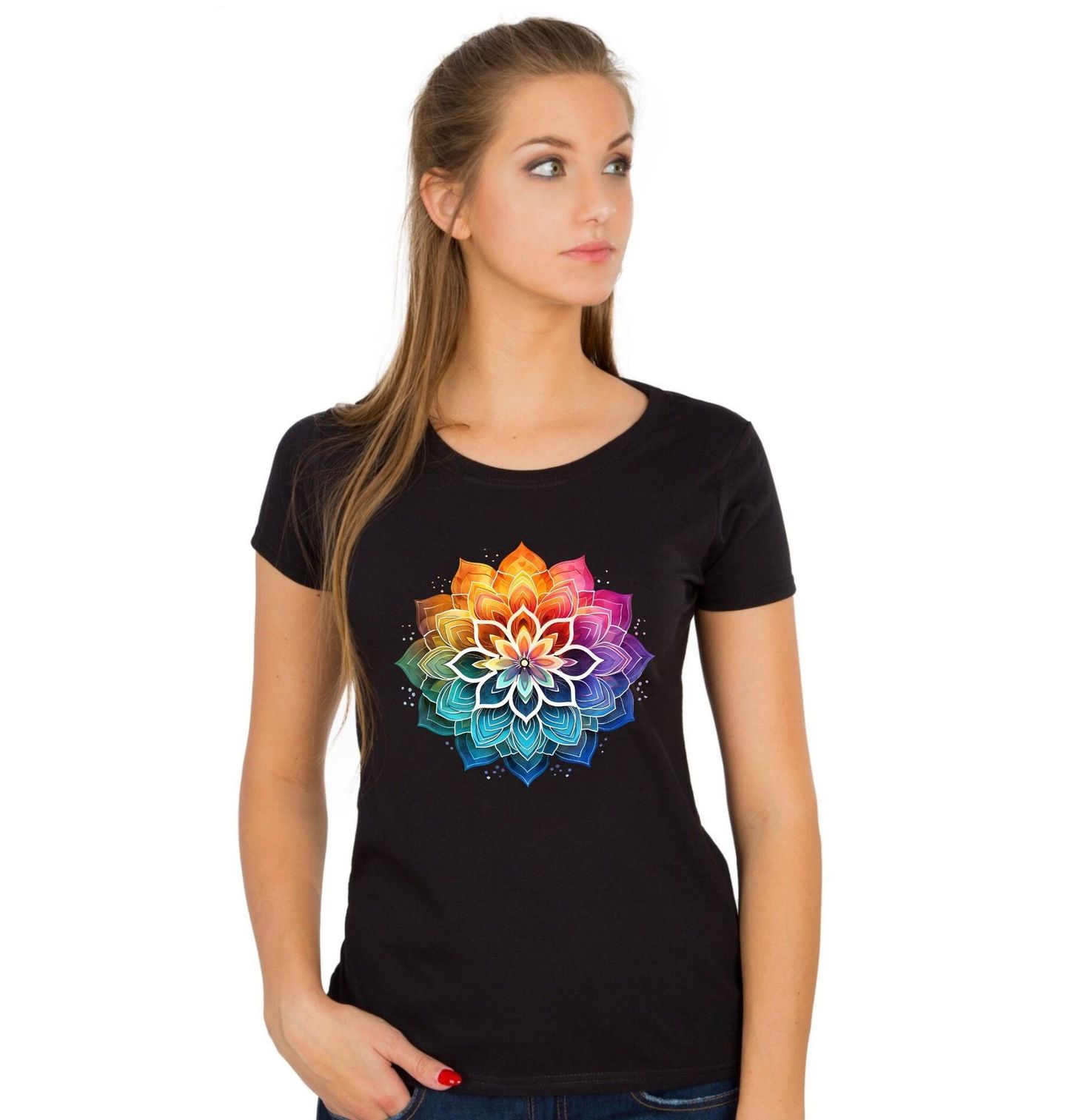 Dámské tričko Květina Harmonie Duhová Mandala. Zářivá a symetrická květina inspirovaná mandalou rozzáří každý den svou energií a barevností. Tento motiv spojuje krásu přírody s duchovní symbolikou – každý lístek květu představuje rovnováhu, klid a propojení s vnitřním světem.