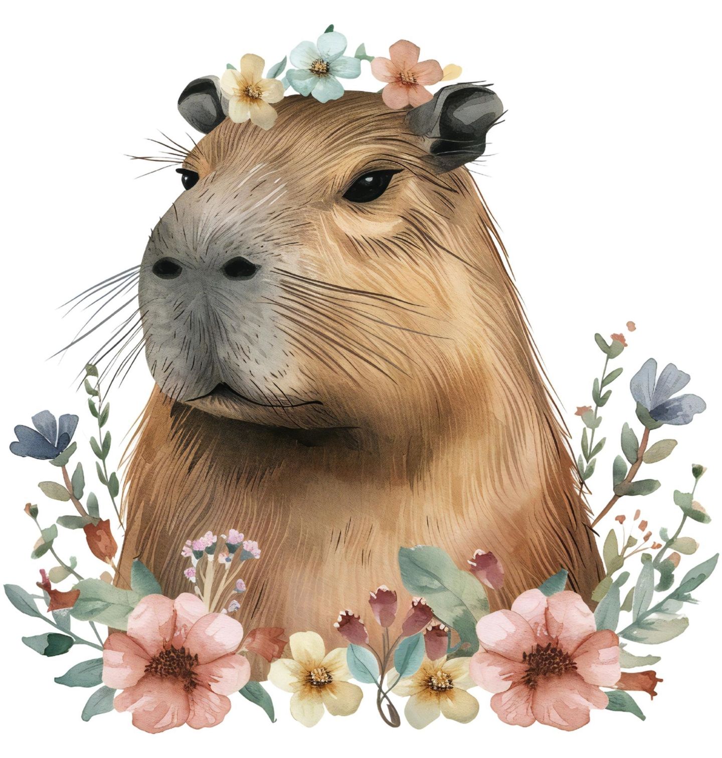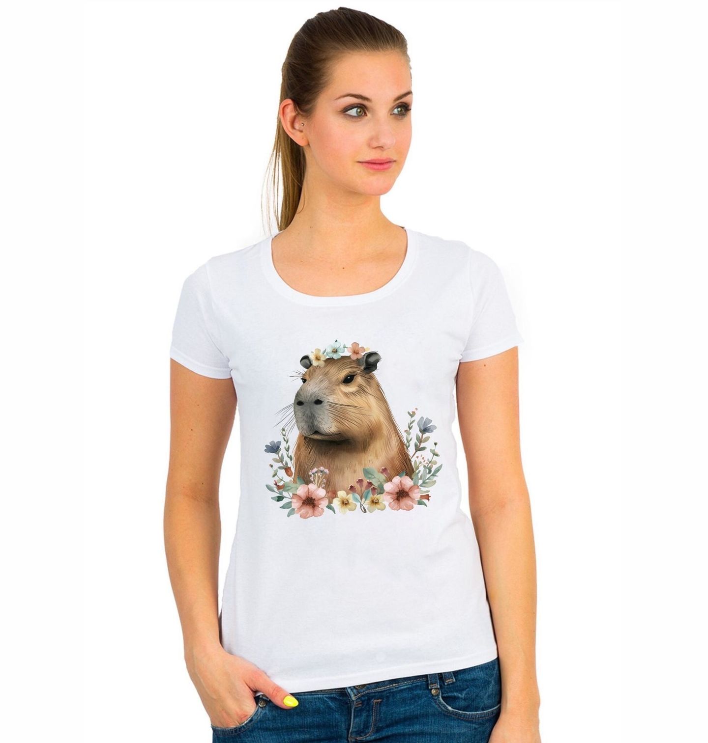 Dámské tričko Květinová Kapybara. Kapybara, mírumilovný hlodavec a miláček internetu, přichází v něžném květinovém pojetí. Tento motiv zachycuje kapybaru obklopenou jemnými lučními květinami v pastelových barvách – ideální pro milovníky přírody, zvířat i jemného designu.