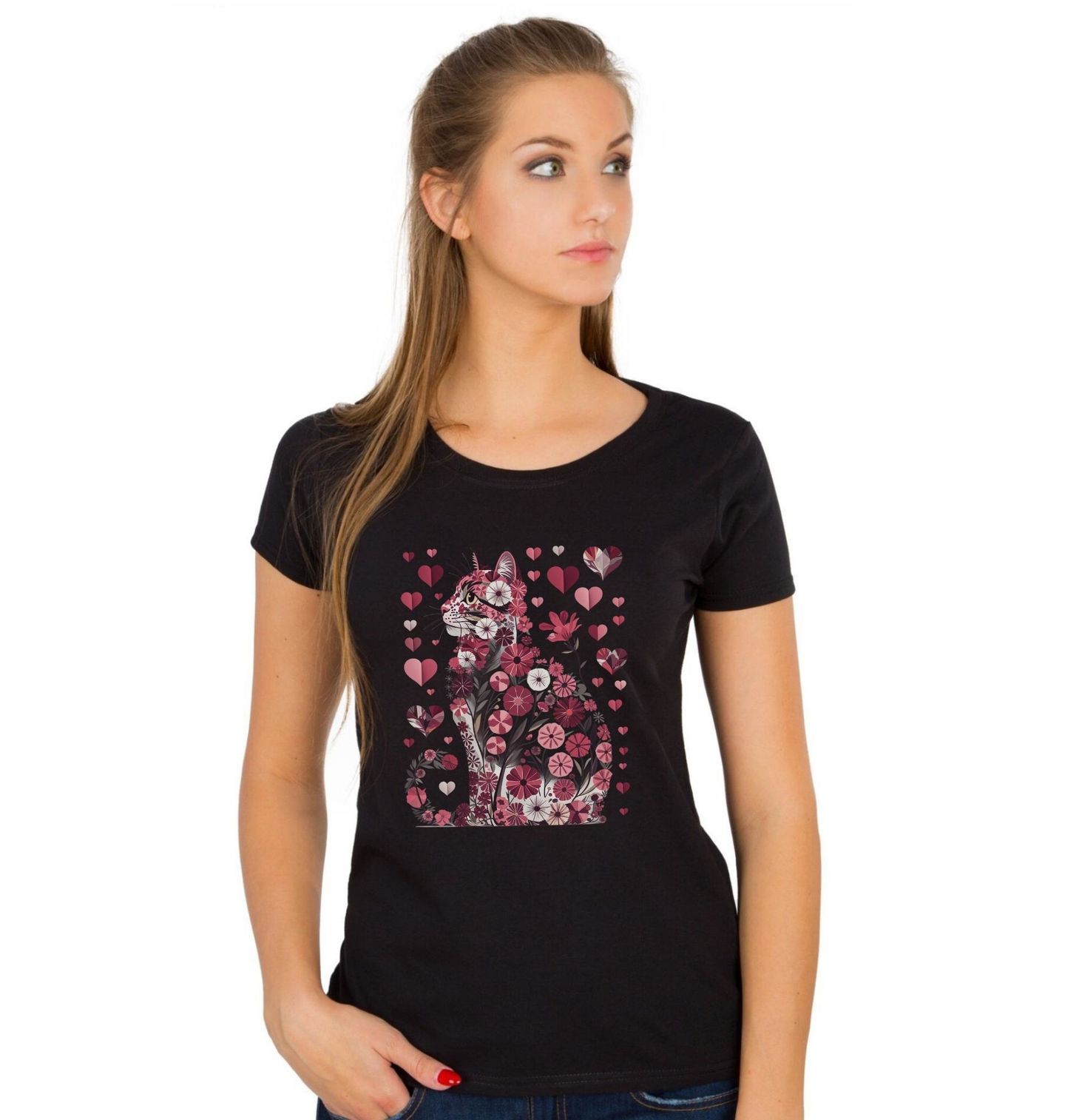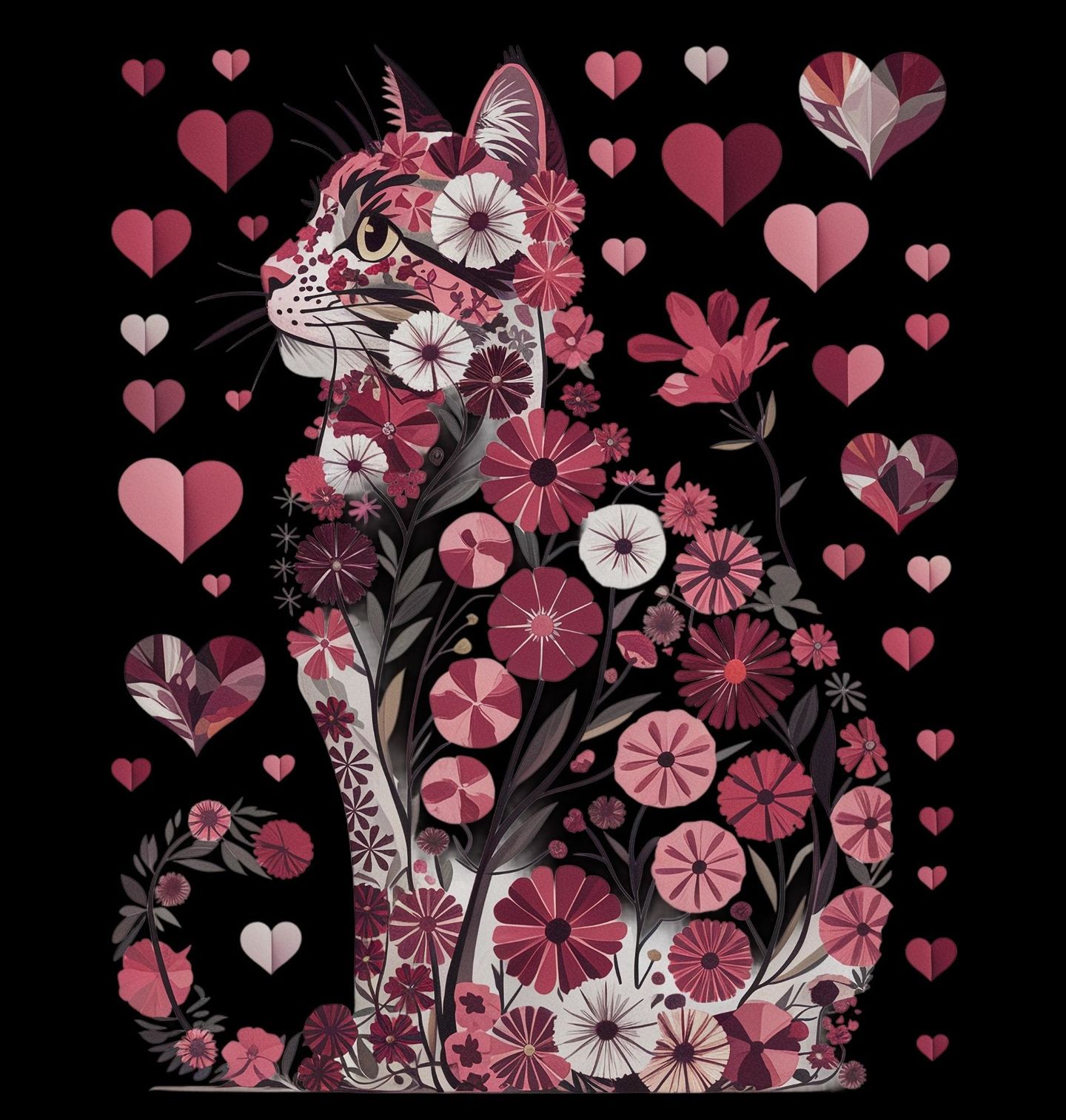 Dámské tričko Květinová Kočka Lásky. Kočka posetá květinami a srdce představuje jemnou eleganci a romantický styl. Pokud je pro tebe láska stejně důležitá jako tvé zvířecí miláčky, tenhle motiv je perfektní volbou. Skvělý dárek na Valentýn, který potěší každého kočičího srdcaře.