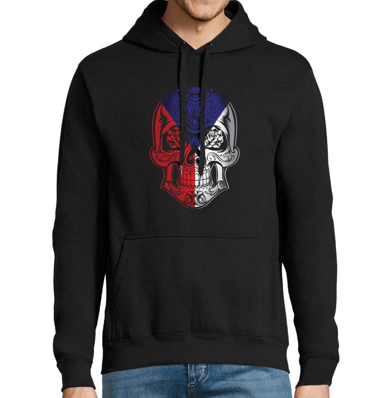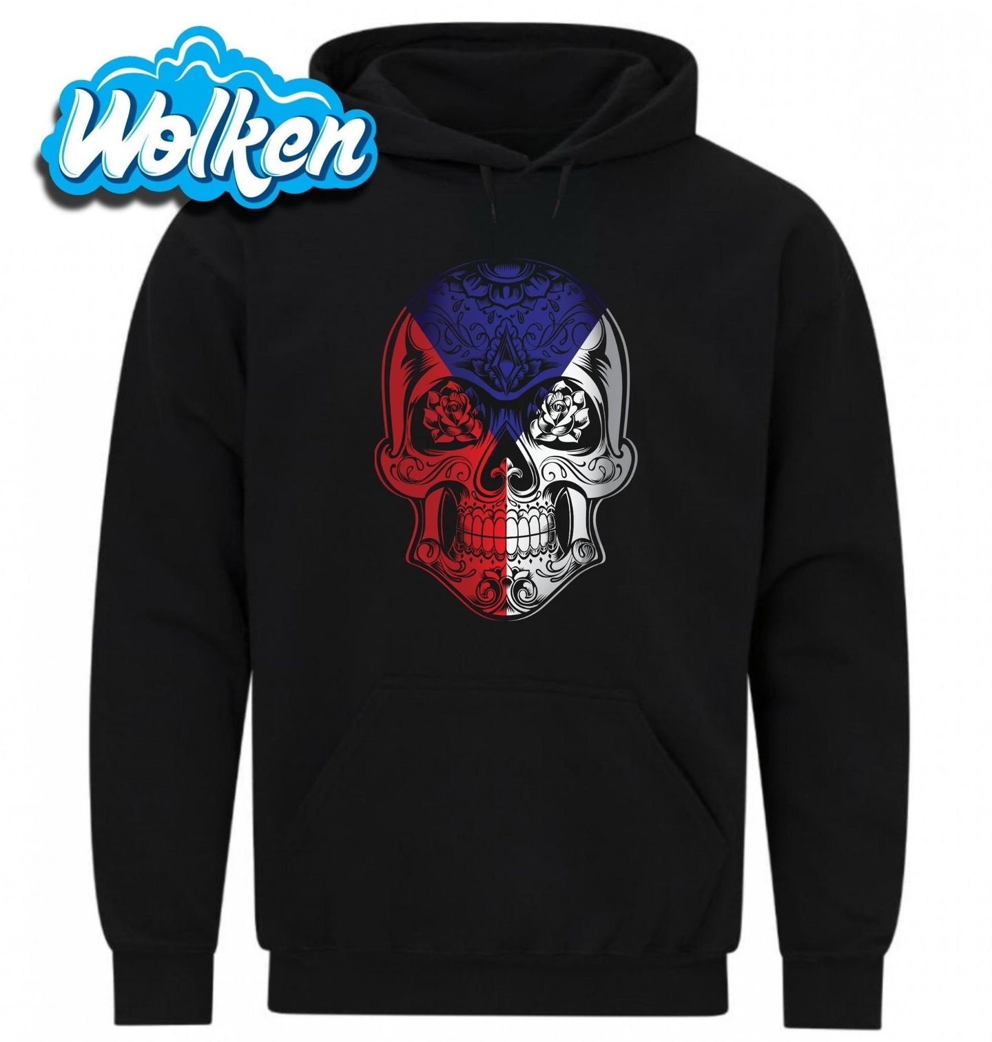 Pánská mikina Květinová Lebka Česko Czech Sugar Skull. Trikolóra v rytmu lebky, květin a tradice – spojení české hrdosti a ikonického stylu "sugar skull", inspirovaného mexickým svátkem mrtvých. Výrazný a detailně propracovaný motiv pro ty, kdo milují umění, kulturu a zároveň chtějí dát jasně najevo, odkud pochází.