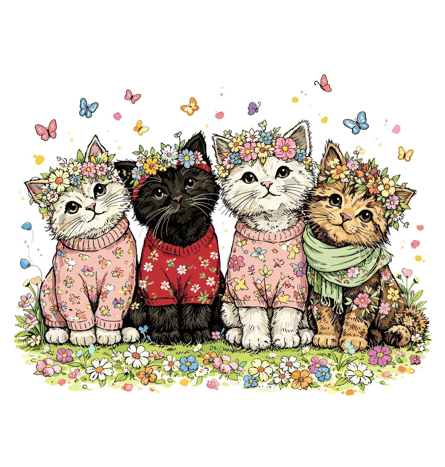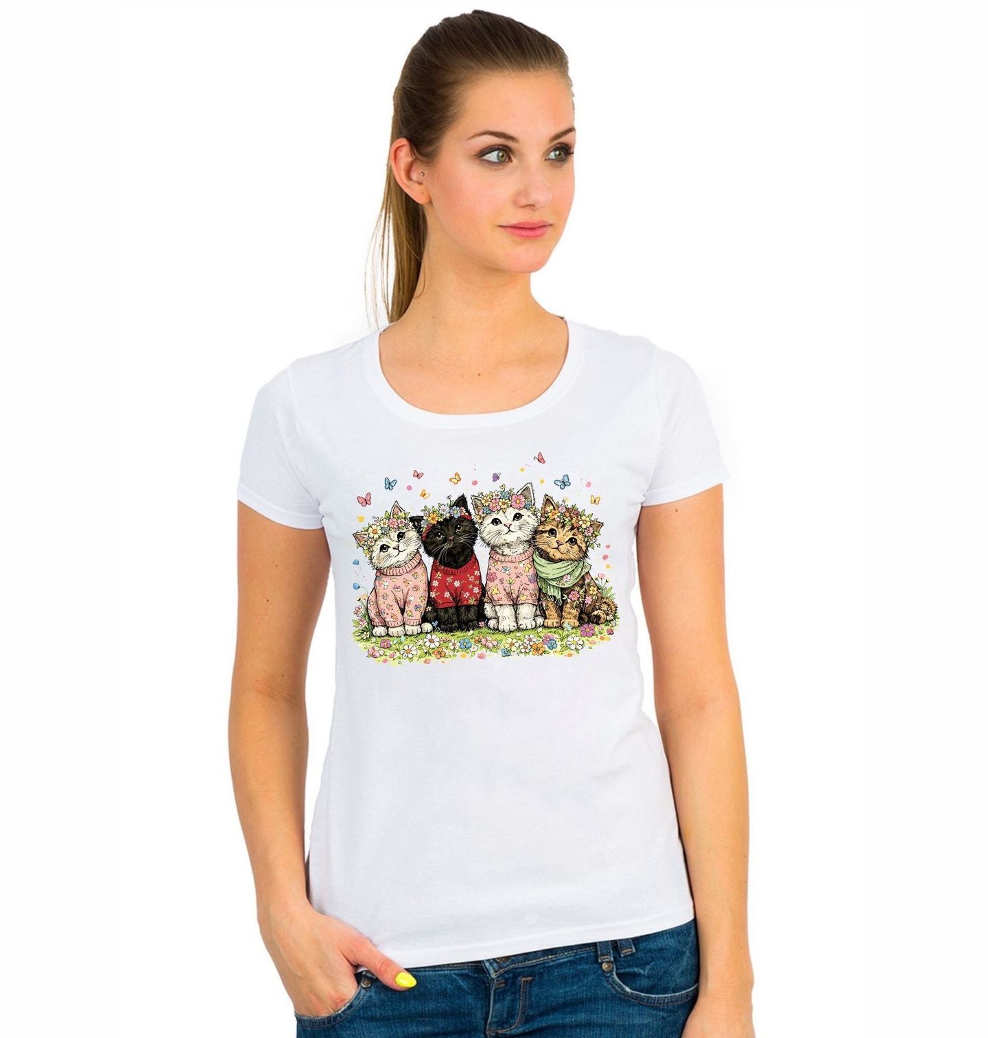Dámské tričko Květinová Parta Koťat. Barevný design koťat zobrazuje čtyři roztomilé kočky sedící v trávě mezi květinami a motýly. Každé koťátko má květinový věneček a stylové oblečení, což vytváří hravou a veselou atmosféru. Tento motiv koťat je ideální pro milovníky zvířat, přírody a roztomilých ilustrací.