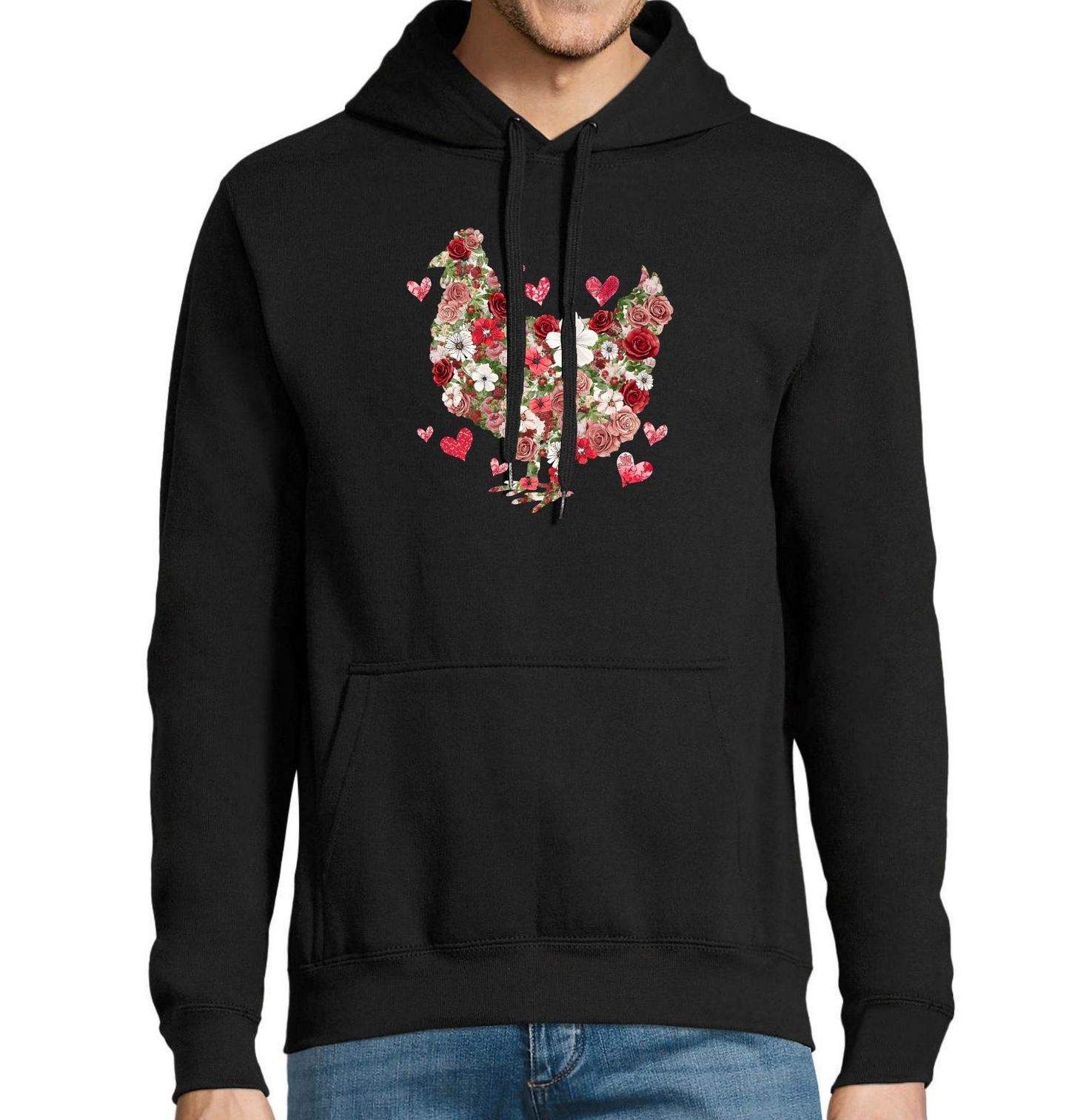 Pánská mikina Květinová slepice. Valentýnská slepice je důkazem, že láska kvete i mezi křídly! Tento romantický motiv z květiny doplněnou o srdce v siluetě slepice je ideální pro každého, kdo má smysl pro humor, vřelost a trochu venkovské romantiky. Tričko, které zaujme milovníky slepic, květin i Valentýna – ať už ho slavíte na dvorku, nebo v kavárně.