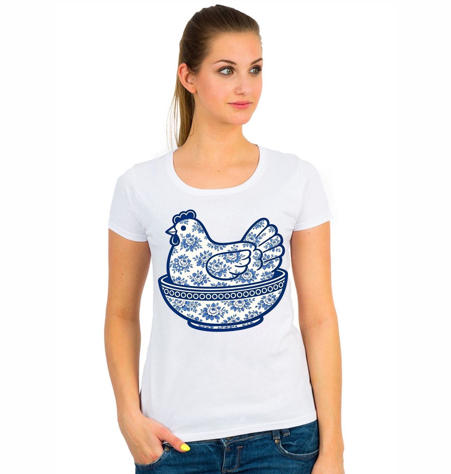 Dámské tričko Květinová Slepice z Porcelánu Folk. Stylový motiv zobrazuje slepice v elegantním modrobílém dekoru inspirovaném tradičním porcelán. Jemné květinové vzory a čisté linie vytváří nadčasový design, který spojuje krásu lidového umění s moderním zpracováním ve stylu folk. Slepice je usazená v dekorativní misce a působí jako ručně zdobený porcelánový kousek, který odkazuje na klidný život.