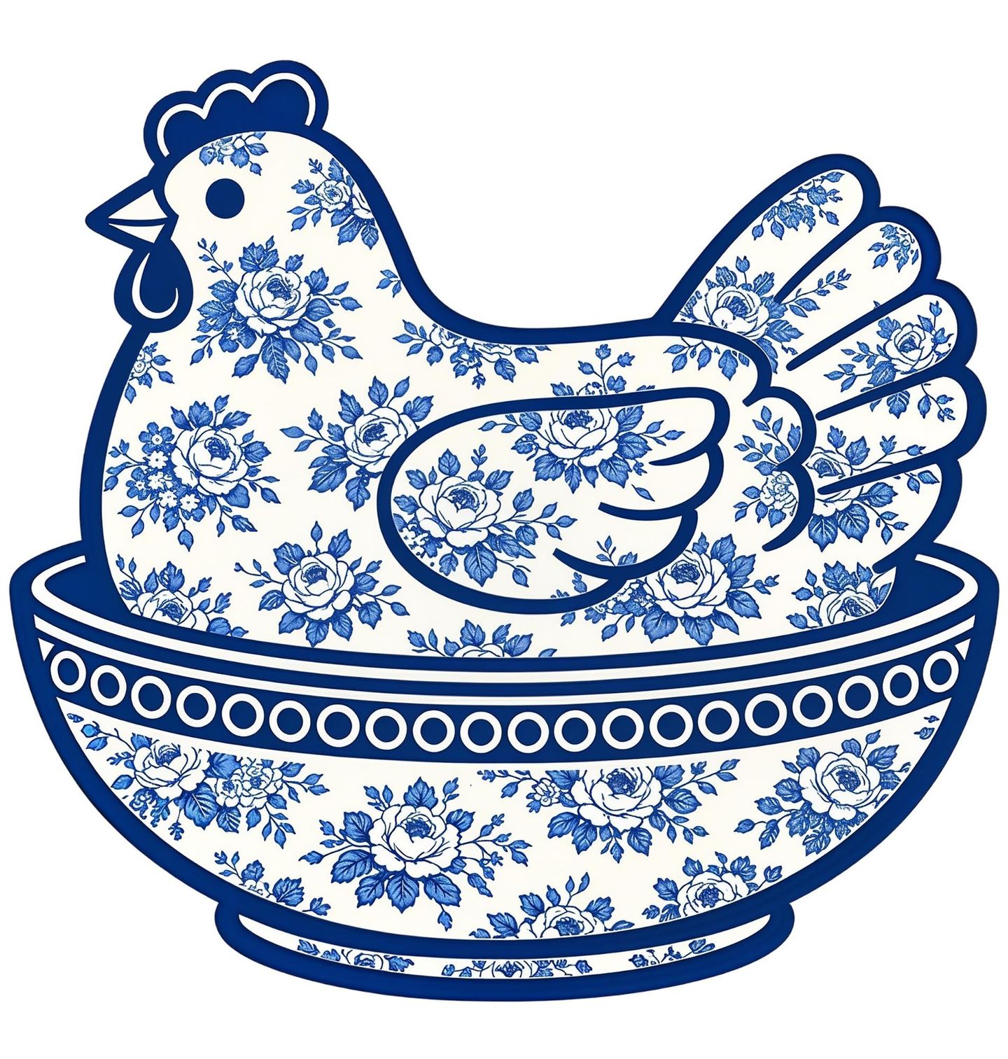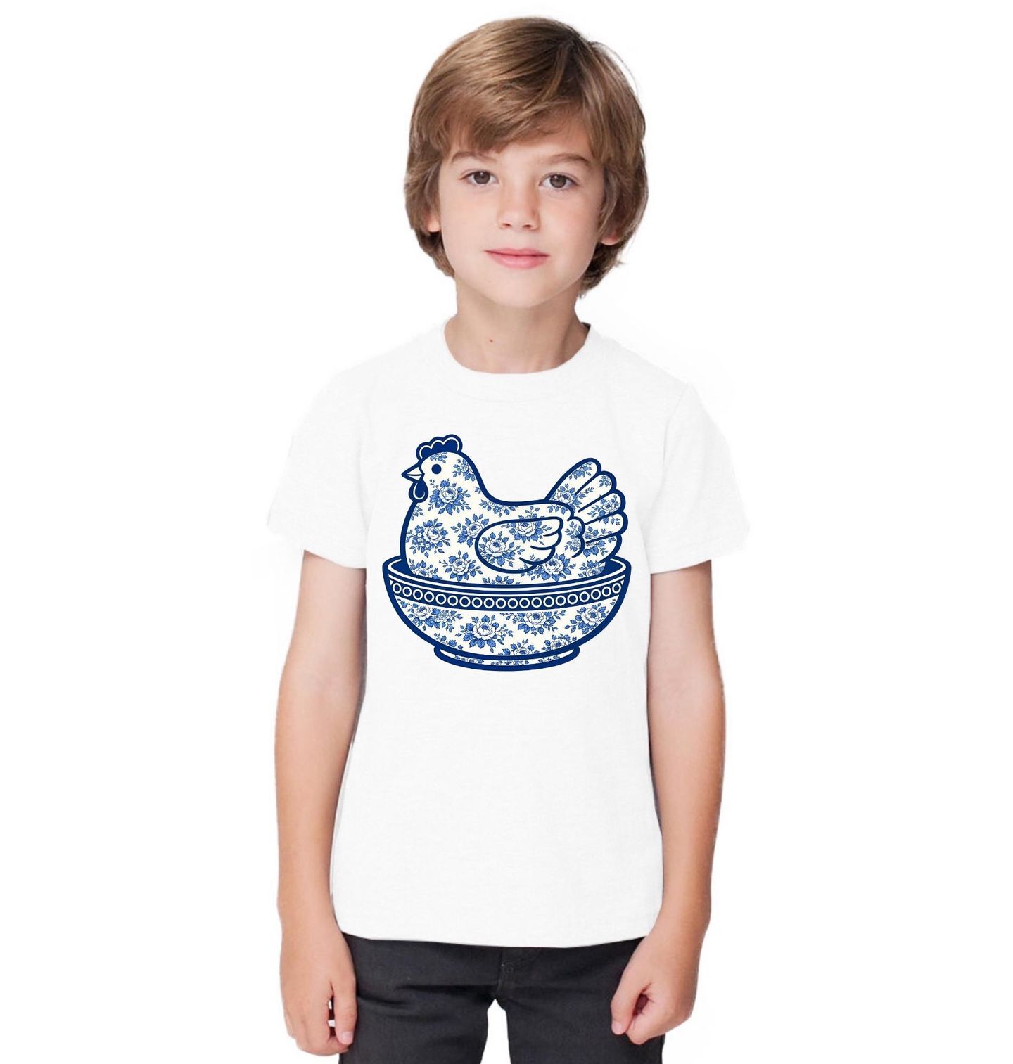 Dětské tričko Květinová Slepice z Porcelánu Folk. Stylový motiv zobrazuje slepice v elegantním modrobílém dekoru inspirovaném tradičním porcelán. Jemné květinové vzory a čisté linie vytváří nadčasový design, který spojuje krásu lidového umění s moderním zpracováním ve stylu folk. Slepice je usazená v dekorativní misce a působí jako ručně zdobený porcelánový kousek, který odkazuje na klidný život.