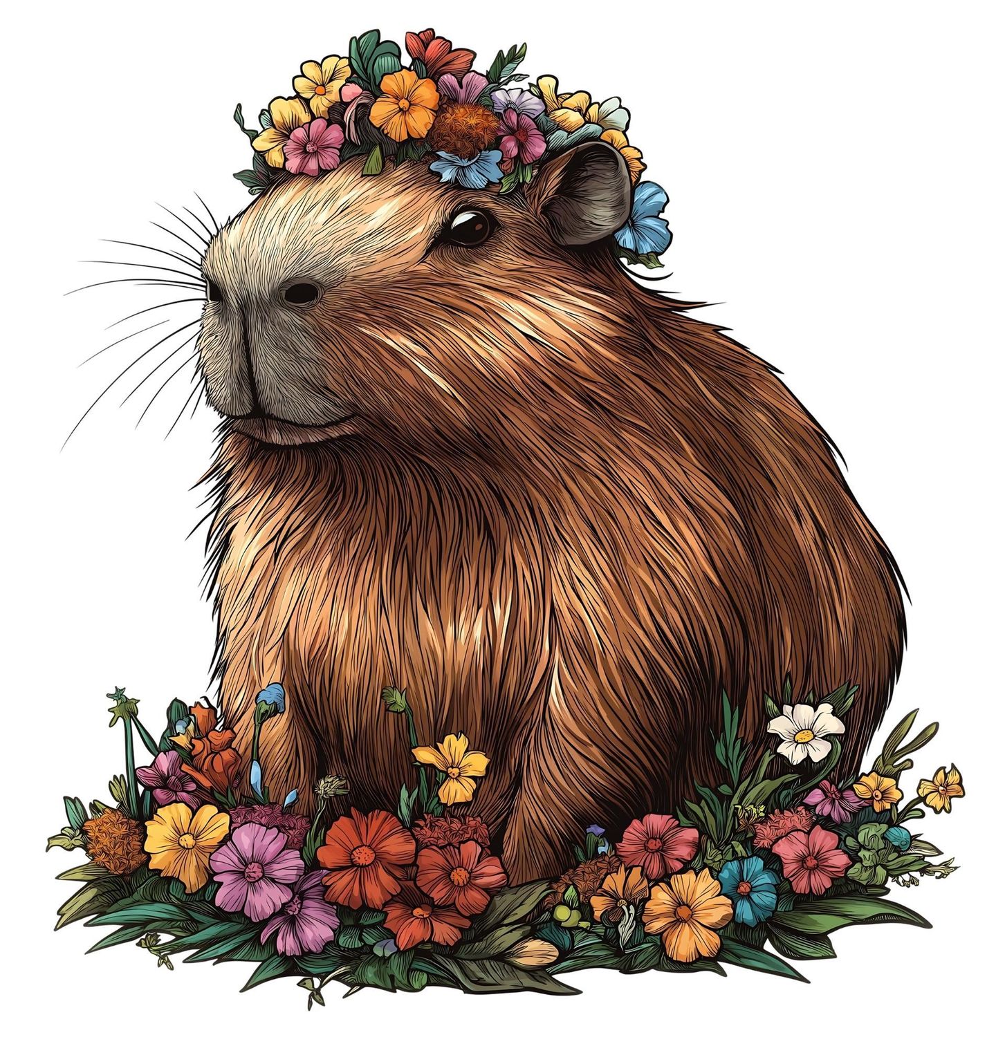 Pánské tričko Květinový Hlodavec Kapybara. Kapybara, symbol klidu a harmonie, tentokrát v jedinečném květinovém provedení! Tento okouzlující motiv zobrazuje kapybaru, největšího hlodavce světa, obklopenou barevnými květy a s květinovým věnečkem na hlavě.