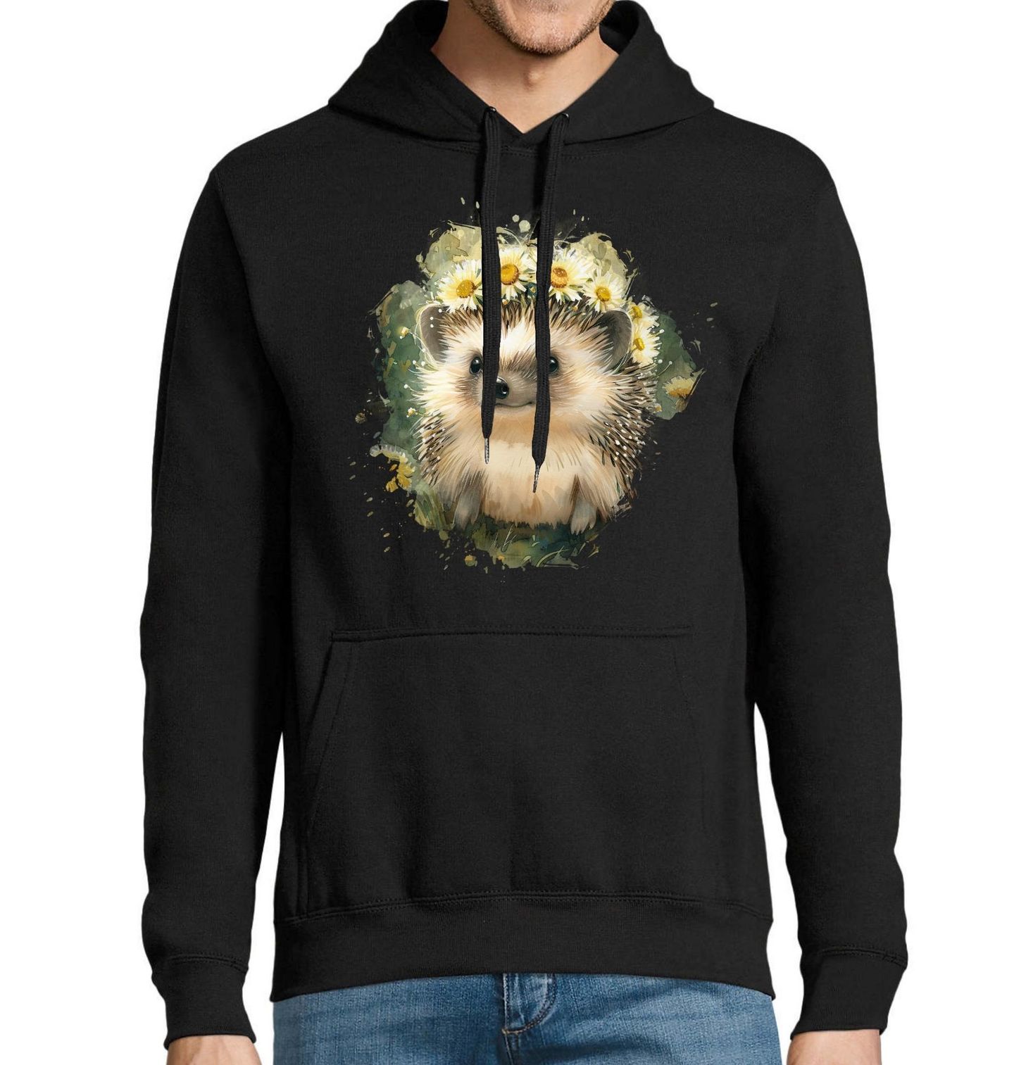 Pánská mikina Květinový Ježek. Tento něžný ilustrativní motiv zobrazuje roztomilého ježka, ozdobeného věnečkem z lučních květiny, který působí klidně, mile a pohádkově. Jemné akvarelové zpracování a teplé přírodní tóny vytvářejí pocit radosti, harmonie a blízkosti k přírodě. ežek symbolizuje laskavost, ochranu a klid, zatímco květiny dodávají celému obrazu svěžest, lehkost a optimistickou náladu.