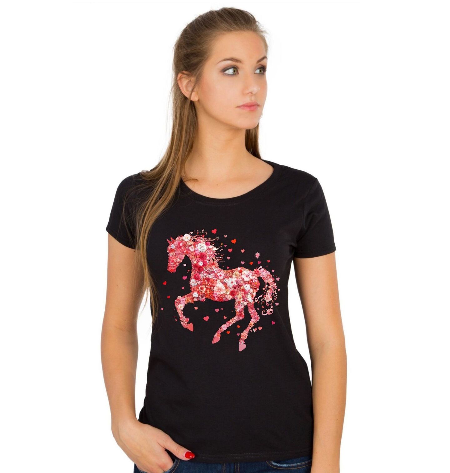 Dámské tričko Květinový Kůň. Originální motiv, kde hlavní roli hraje elegantní kůň vytvořený z jemných detailů a barevných dekorací. Bohaté květiny v romantických odstínech růžové a červené dodávají designu něžný a snový vzhled, který zaujme na první pohled. Stylová kompozice spojuje sílu zvířete s lehkostí přírody a vytváří výrazný motiv vhodný pro každodenní nošení.