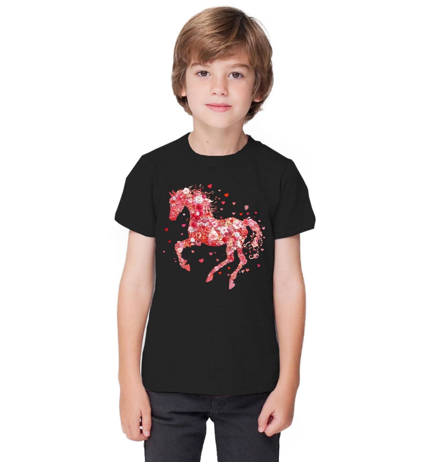Dětské tričko Květinový Kůň. Originální motiv, kde hlavní roli hraje elegantní kůň vytvořený z jemných detailů a barevných dekorací. Bohaté květiny v romantických odstínech růžové a červené dodávají designu něžný a snový vzhled, který zaujme na první pohled. Stylová kompozice spojuje sílu zvířete s lehkostí přírody a vytváří výrazný motiv vhodný pro každodenní nošení.