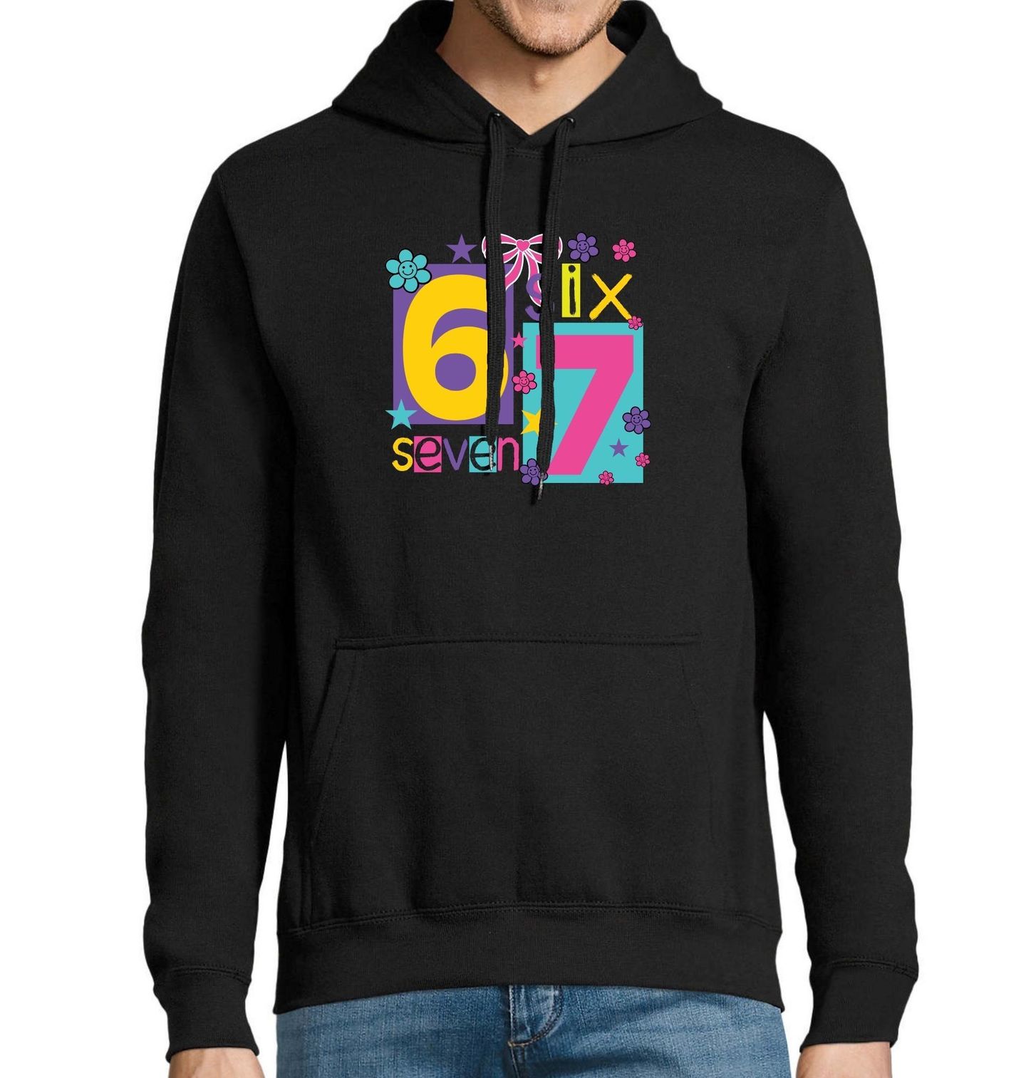 Pánská mikina Květinový Meme 67 Six Seven. Velká žlutá šestka a růžová sedmička doplněná o nápisy six seven jsou obklopené kytičkami, hvězdičkami a mašličkou, takže působí hravě a pozitivně. Celý motiv navíc jemně odkazuje na oblíbený internetový trend meme 67 six seven.