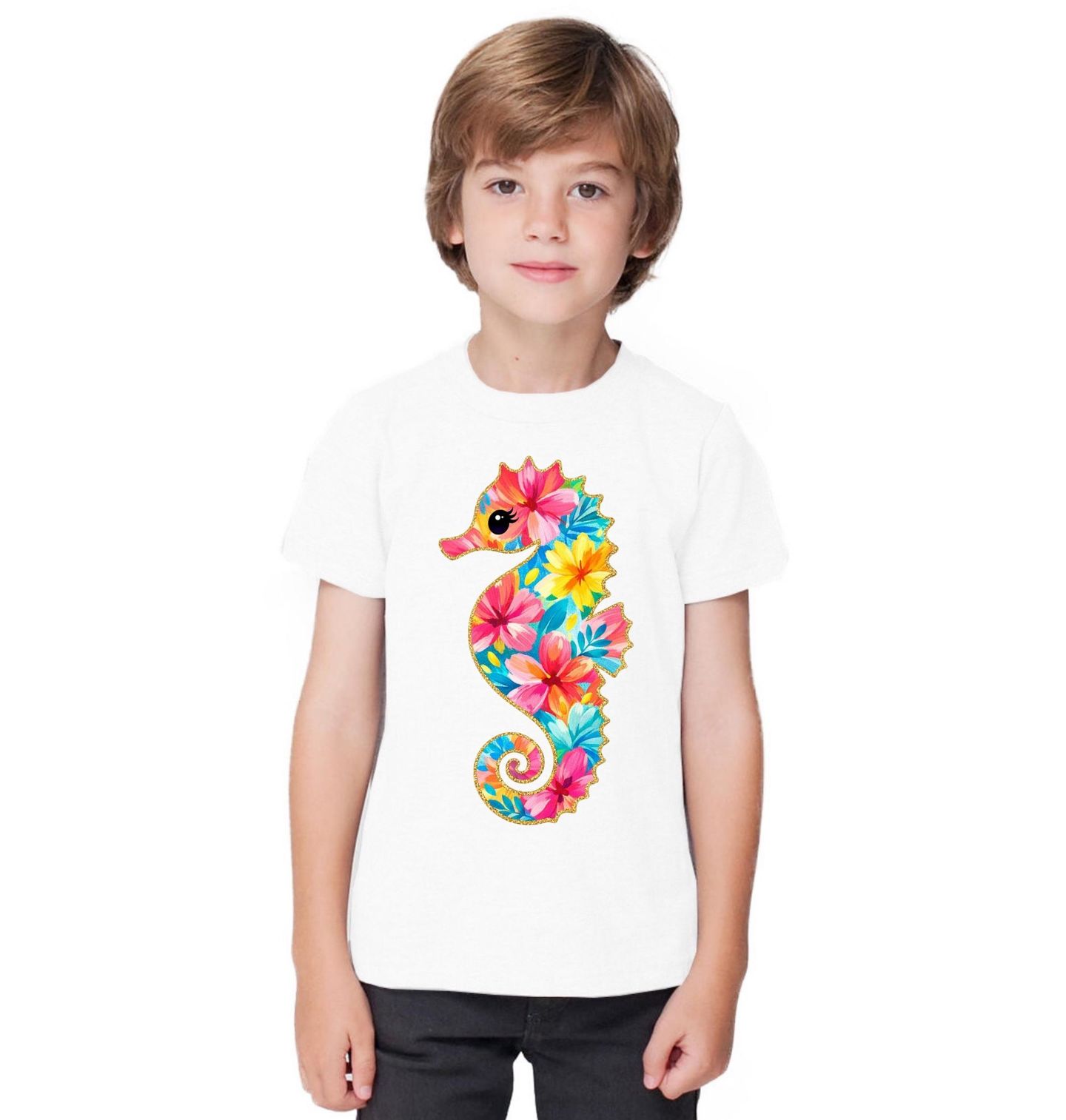 Dětské tričko Květinový Mořský Koník. Elegantní ilustrace mořského koníka zdobeného barevnými květinami vytváří unikátní spojení přírody a oceánu. Detailní květinový vzor dodává designu jemnost a originalitu. Ideální pro každého, kdo miluje mořské motivy, květiny a estetický design.