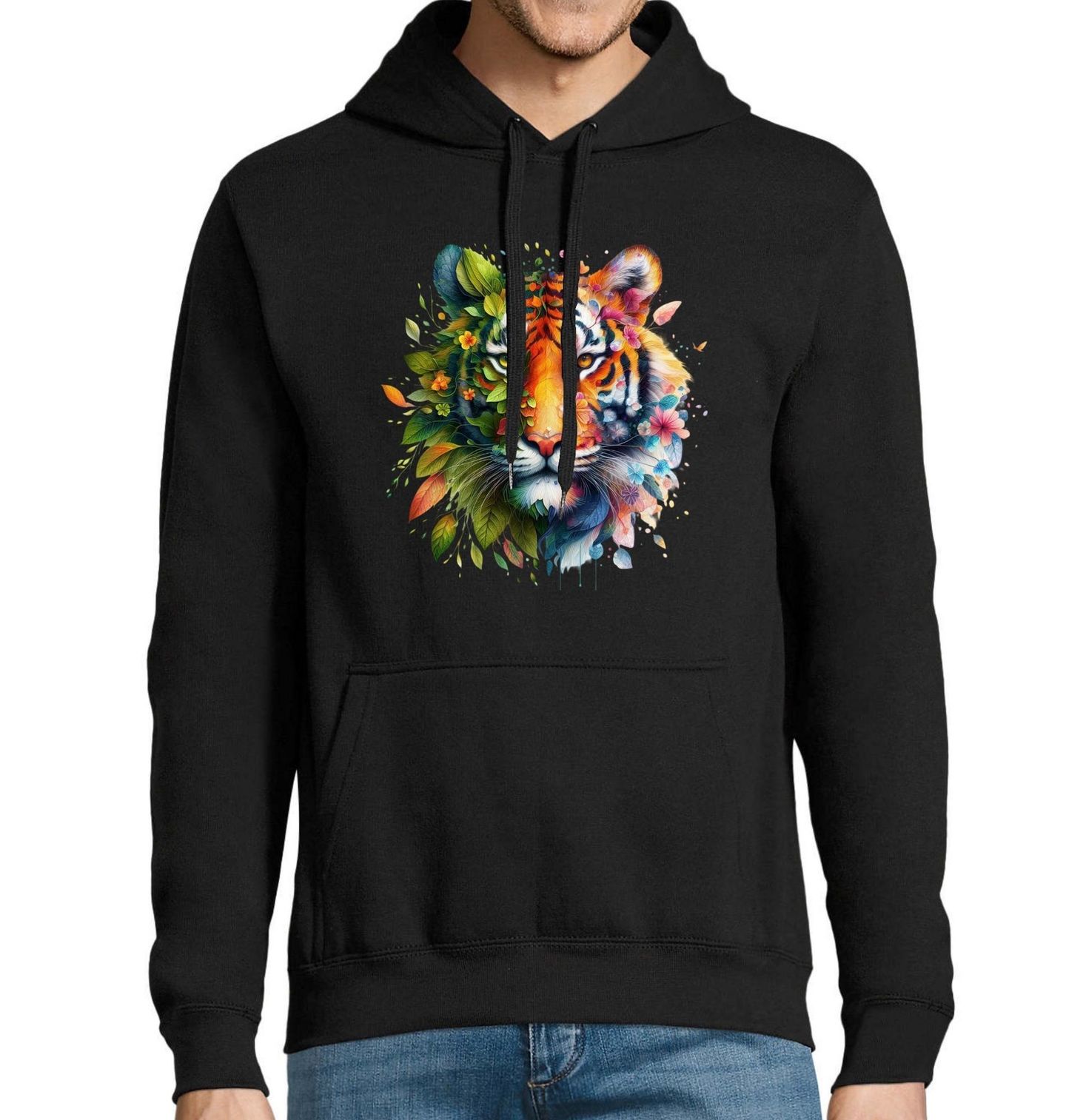Pánská mikina Květinový Tygr. Spojení síly a krásy v jediné tváři. Tento tygr není jen šelma – je symbolem rovnováhy, kde květiny neznamenají slabost, ale klid před bouří. Je to pohled přírody, která umí být něžná i nespoutaná zároveň.