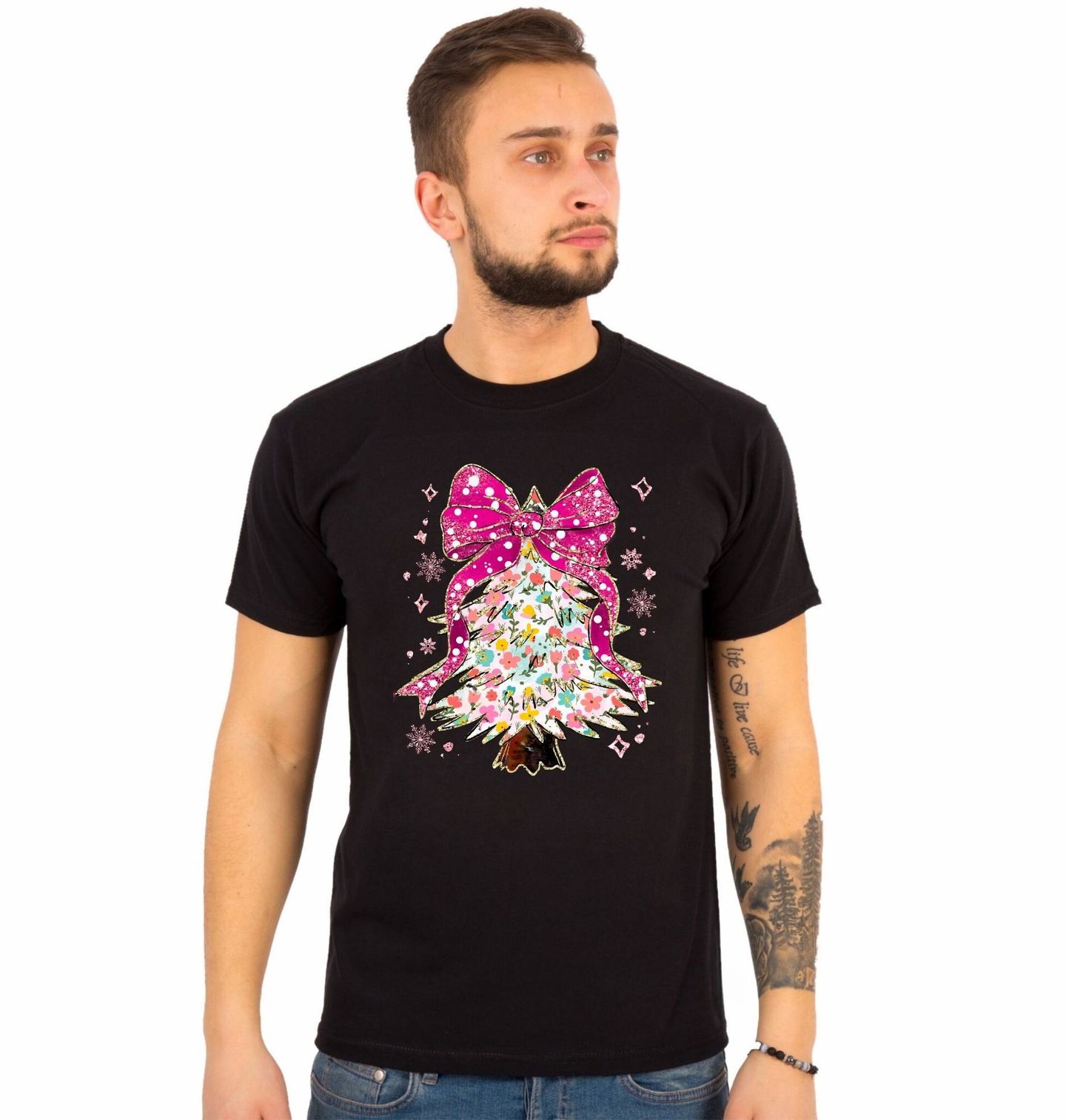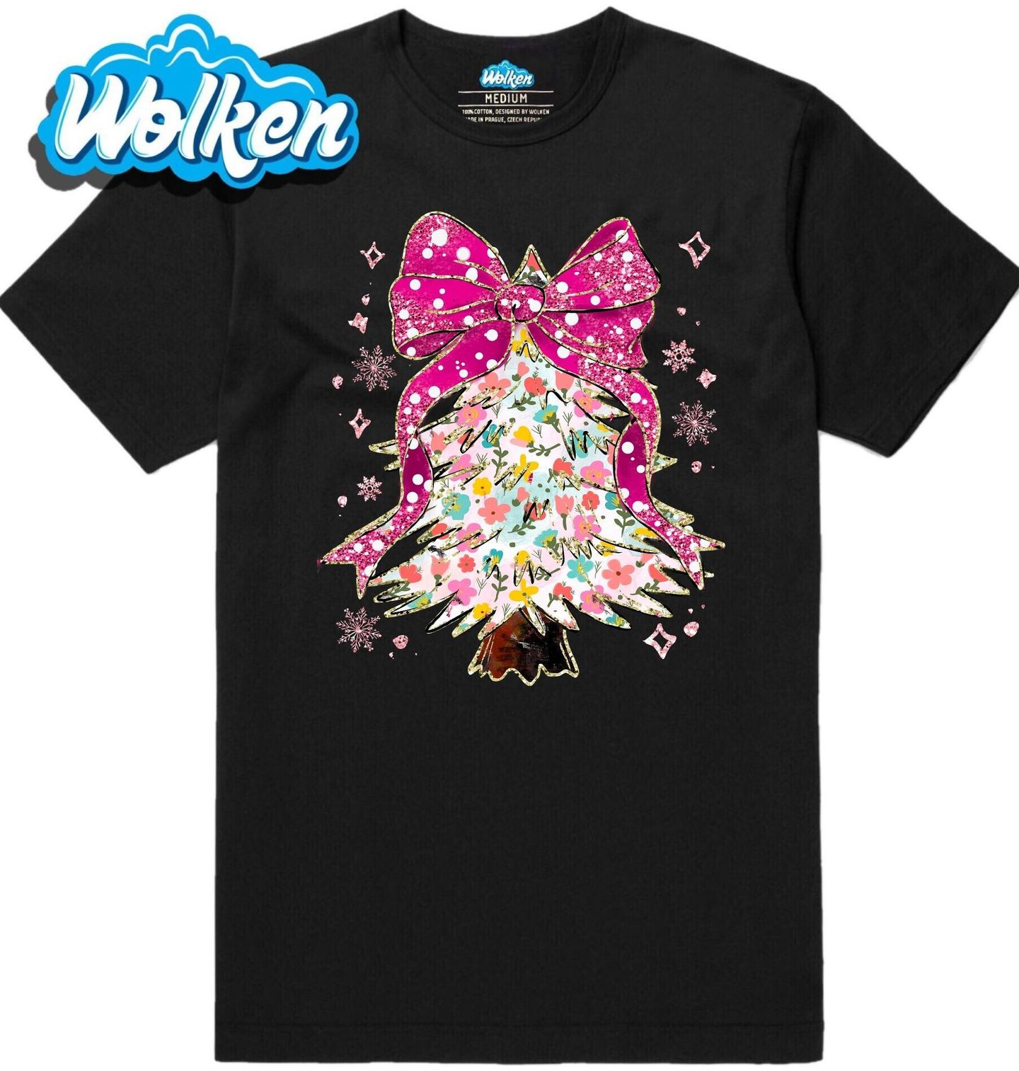 Pánské tričko Květinový Vánoční Stromeček. Rozjasněte sváteční sezónu tímto okouzlujícím motivem, který spojuje jemnou květinovou estetiku s klasickým symbolem Vánoce. Barevný vánoční stromeček je posetý pastelovými květy a zdobený výraznou růžovou mašlí s třpytivým efektem.