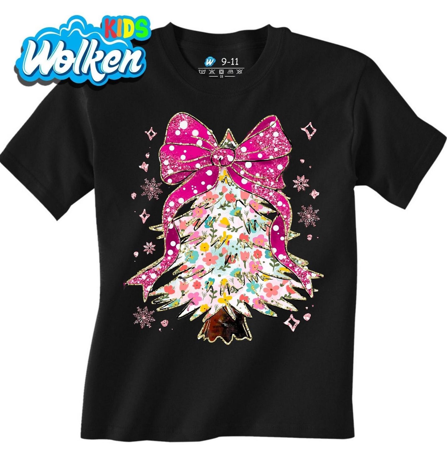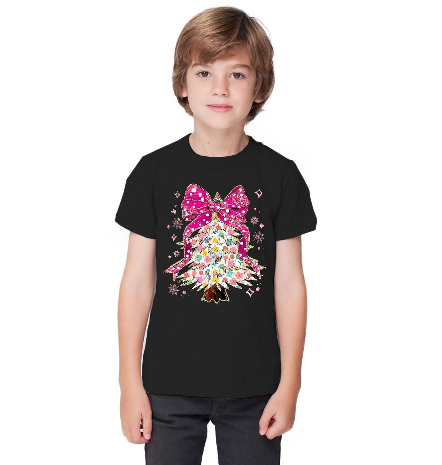 Dětské tričko Květinový Vánoční Stromeček. Rozjasněte sváteční sezónu tímto okouzlujícím motivem, který spojuje jemnou květinovou estetiku s klasickým symbolem Vánoce. Barevný vánoční stromeček je posetý pastelovými květy a zdobený výraznou růžovou mašlí s třpytivým efektem.