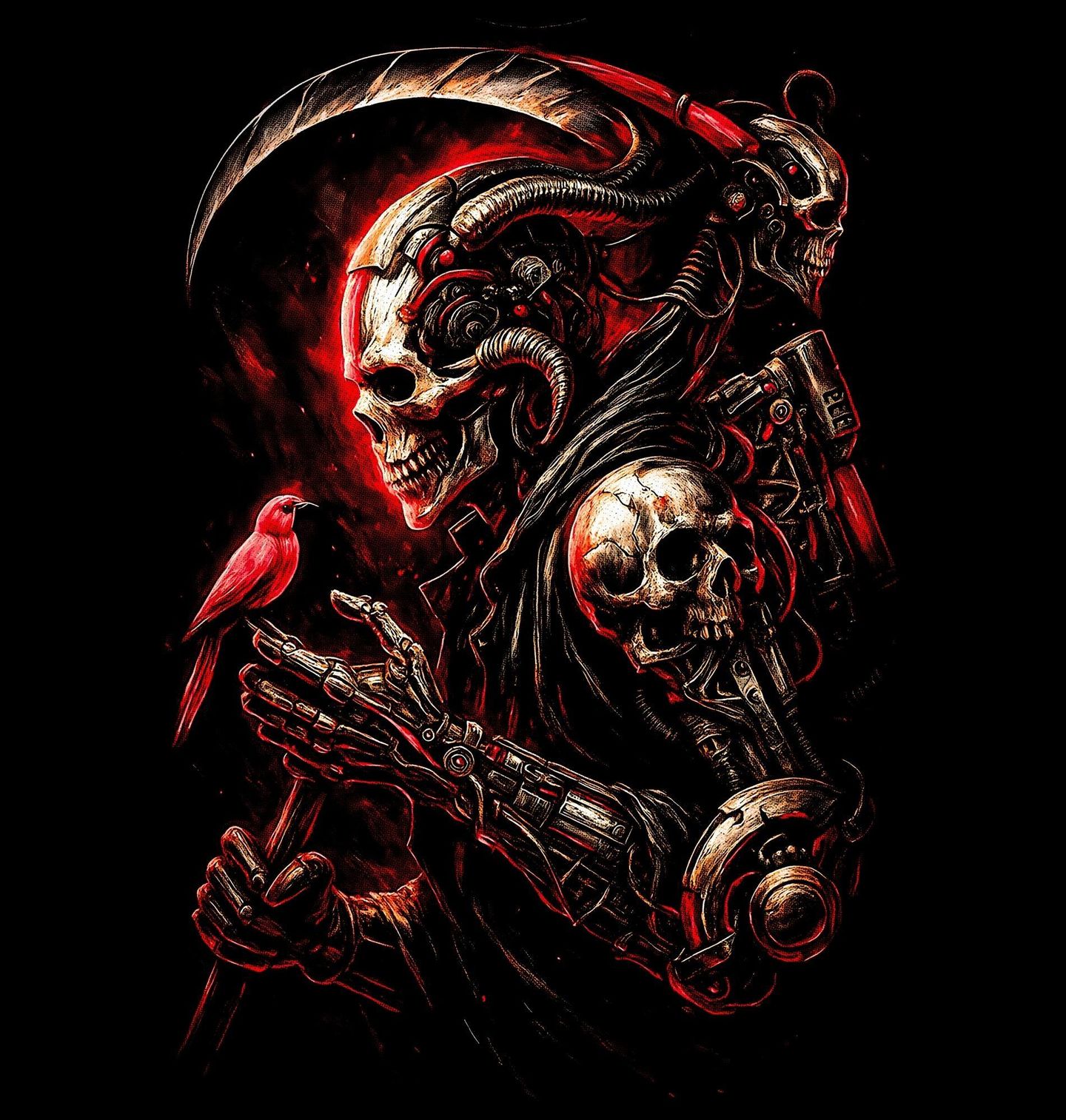 Dámské tričko Kyberpunkový Kostlivec s Ptáčkem. Unikátní a detailní motiv zobrazuje futuristickou postavu, kde kostlivec v kyberpunkovém stylu drží malého ptáčka na své kostěné ruce. Kombinace technologie, temnoty a jemného kontrastu života vytváří silný vizuální zážitek. Precizní detaily, červené akcenty a temná atmosféra dělají z tohoto designu nepřehlédnutelný kousek.