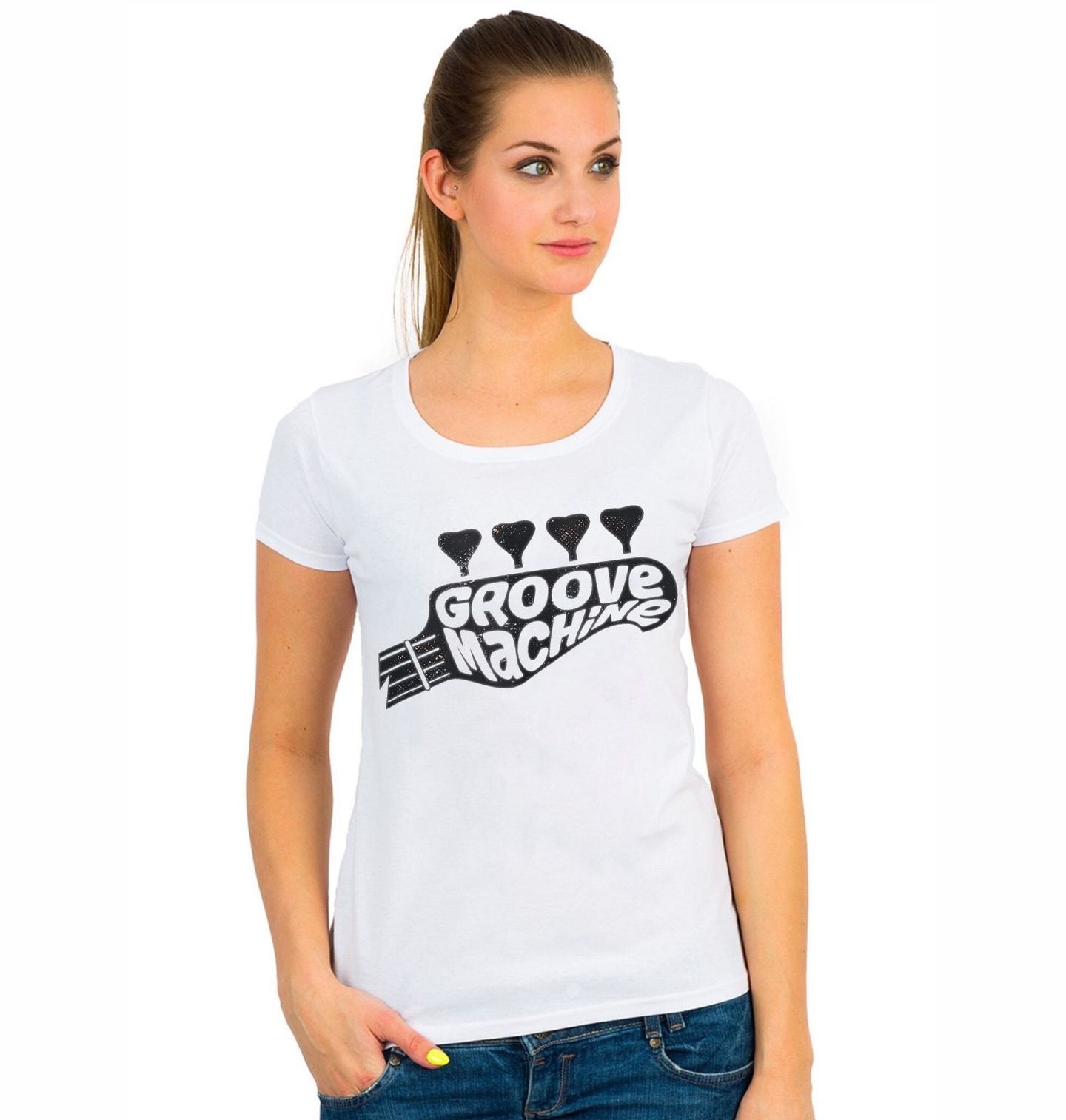 Dámské tričko Kytara Rytmu Groove Machine. Stylový hudební motiv s nápisem „Groove Machine“ zasazeným do tvaru hlavice nástroje, který jasně ukazuje, že baskytara je motor každého pořádného groovu. Design kombinuje výraznou typografii s prvky ladicích mechanik a vytváří originální vizuál pro všechny, kdo milují hluboké tóny a rytmus.