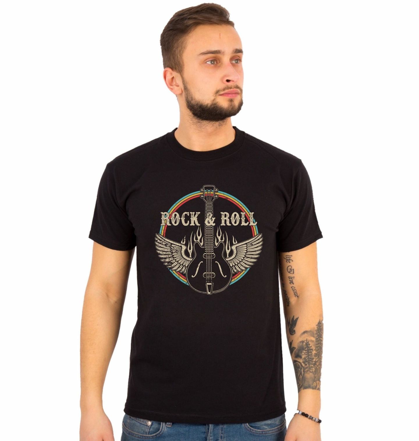 Pánské tričko Kytara s Křídly Rock & Roll. Stylový motiv pro všechny milovníky rock and rollu – kytara obklopená plameny a majestátními křídly symbolizuje nespoutaného ducha hudby. V kombinaci s retro duhou a nápisem "Rock & Roll" oslavuje tahle grafika klasickou éru rockové energie. Pro ty, kterým v žilách koluje hudba.