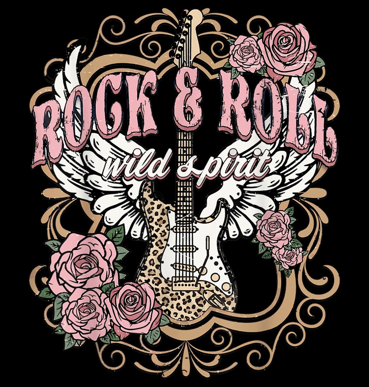 Dětské tričko Kytara s Křídly Rock & Roll Wild Spirit. Romanticky laděný, ale zároveň energický motiv s nápisem Rock & Roll Wild Spirit spojuje jemnost růží, andělská křídla a dominantní kytara s leopardím vzorem. Bohaté ornamenty a vintage styl vytvářejí výrazný design, který dokonale vystihuje svobodu, vášeň a nespoutanost, kterou přináší rock and roll. Pokud je pro tebe rock and roll víc než jen hudba, tenhle design to řekne za tebe.