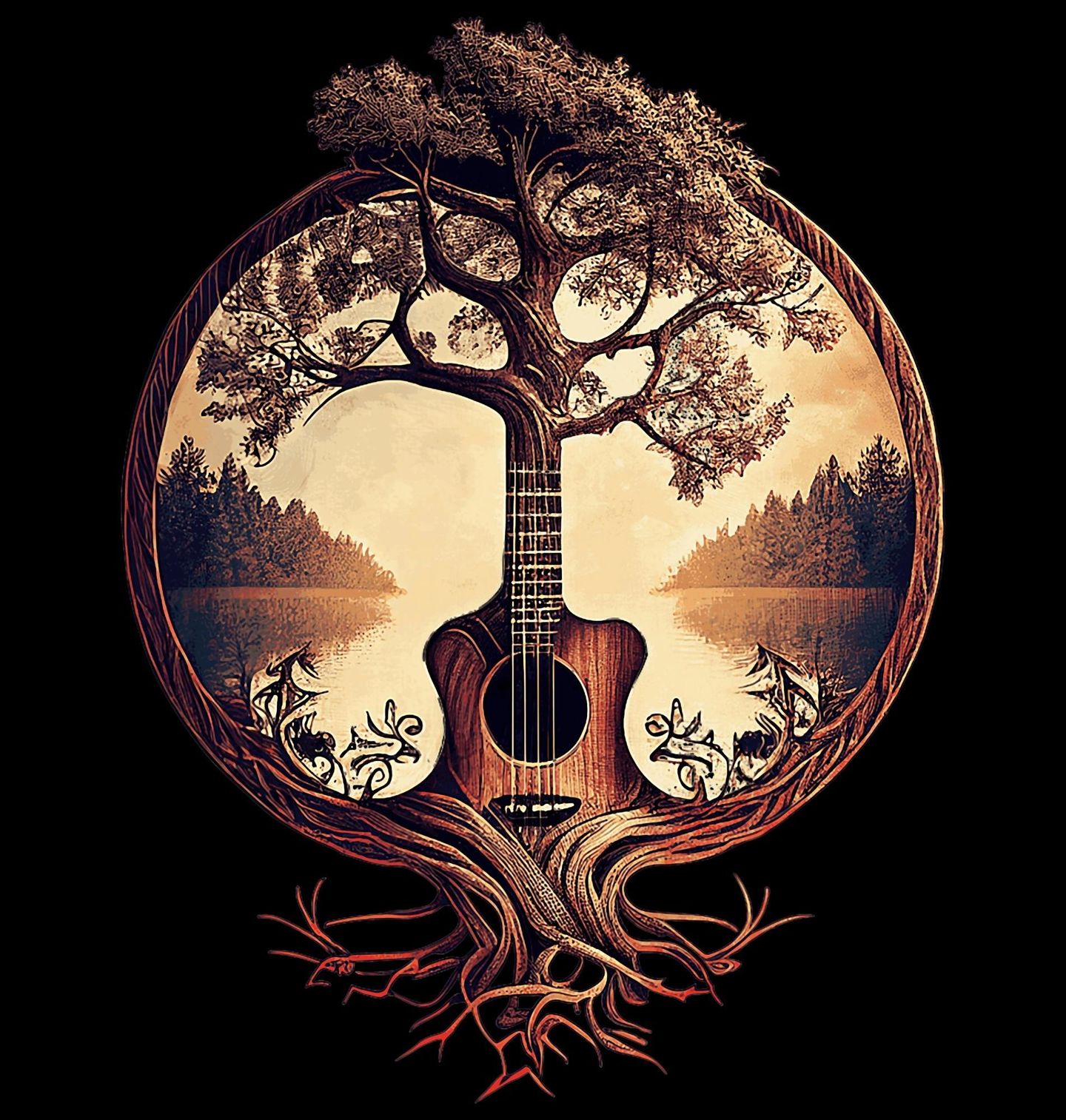 Pánské tričko Kytarový Strom Života. Jedinečný motiv propojuje kytaru a strom života do harmonického symbolu hudby, přírody a hlubokých kořenů. Tělo nástroje plynule přechází v majestátní strom života, jehož větve se rozprostírají do krajiny s jezerem a lesem. Kořeny prorůstají do země a vytvářejí silný vizuální základ, který zdůrazňuje spojení hudby s přírodou.