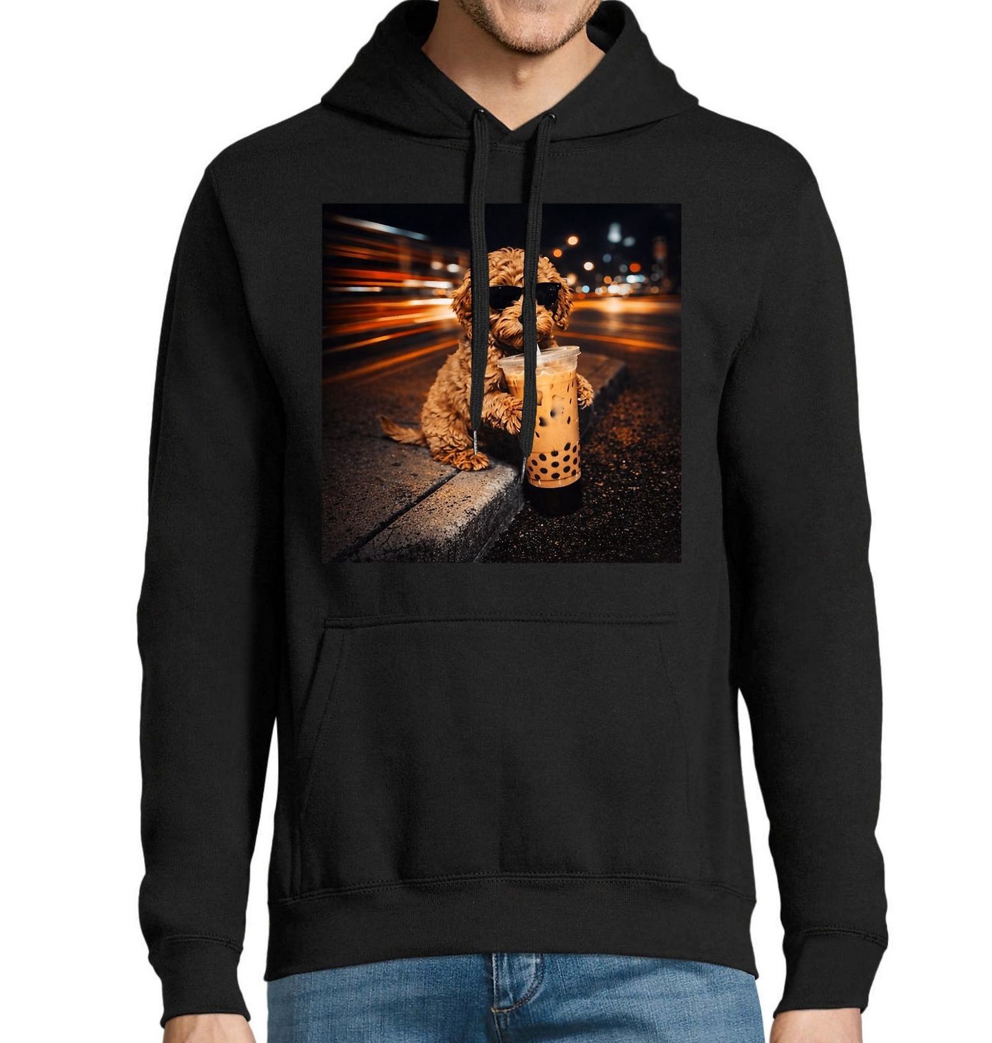 Pánská mikina Labradoodle s Bubble Tea. Moderní a hravý motiv zobrazuje psa plemene labradoodle, který si v nočním městě vychutnává populární nápoj bubble tea (také nazývaný boba). Stylový labradoodle se slunečními brýlemi působí sebevědomě a cool, zatímco světla města vytvářejí dynamickou atmosféru