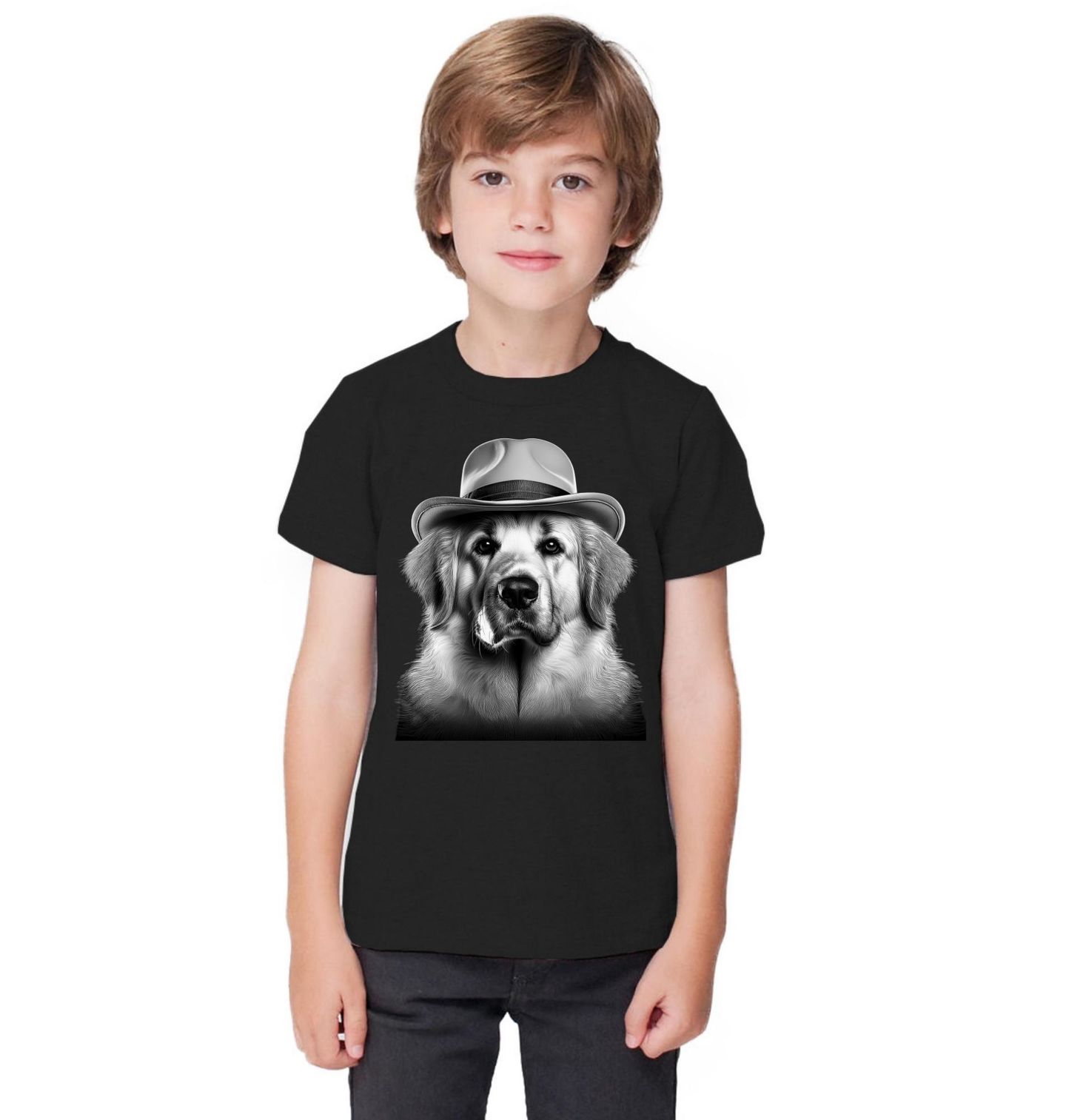 Dětské tričko Labradorský retrívr s Kloboukem. Labradorský retrívr je přátelský a oddaný pes, který si získal srdce lidí po celém světě svou milou povahou a inteligencí. Tento stylový motiv zachycuje retrívra s kloboukem jako skutečného gentlemana, který vyzařuje klid, sílu a eleganci. Každý pejskař ocení charakteristický výraz a detailní zpracování, které vystihuje přirozenou noblesu, jakou Labradorský retrívr představuje.