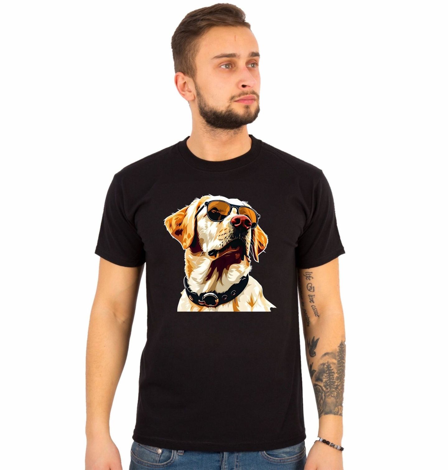 Pánské tričko Labradorský Retrívr se Slunečními Brýlemi. Moderní a stylový motiv představuje psa plemene labradorského retrívra s tmavými brýlemi, který působí sebevědomě a elegantně. Minimalistický design a výrazné barvy dodávají ilustraci moderní charakter. Tento psí motiv je ideální pro všechny, kdo milují labradory.