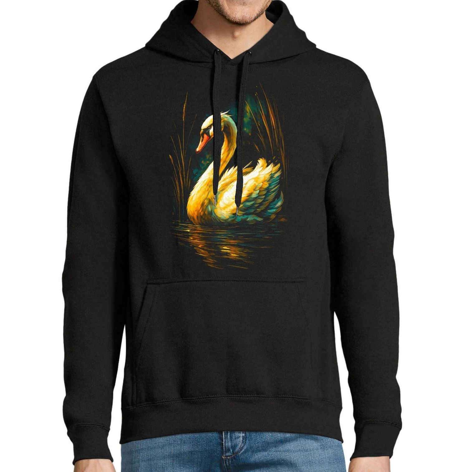 Pánská mikina Labuť velká. Labuť velká je ikonický pták, který je po staletí spojován s láskou, věrností a krásou. Její klidný postoj a plynulý pohyb po vodě působí uklidňujícím dojmem a činí z tohoto motivu ideální volbu pro každého, kdo hledá spojení přírody, elegance a nadčasového stylu.