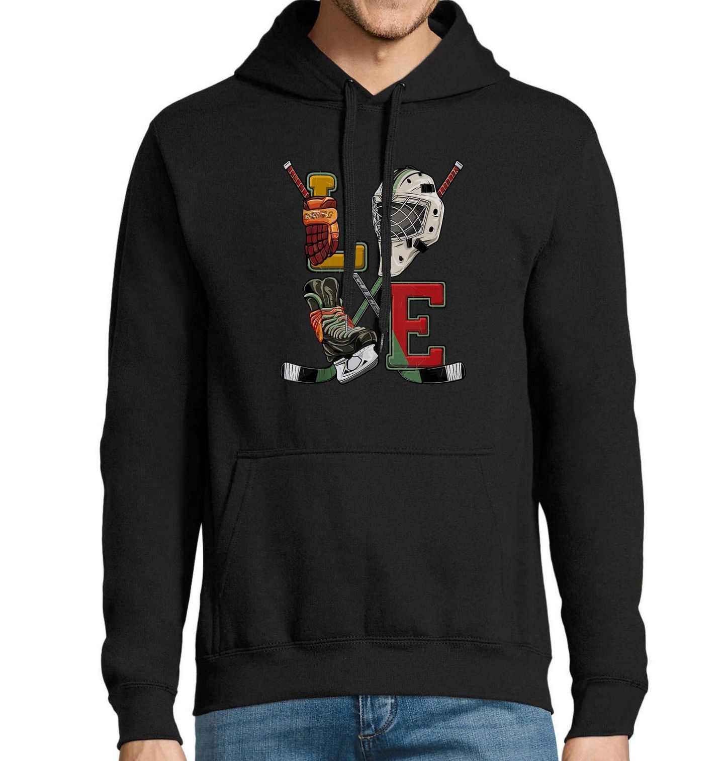 Pánská mikina Láska k Hokeji LOVE. Sportovní láska v té nejtvrdší podobě! Motiv složený z hokejové výstroje, bruslí, hokejek a masky gólmana vytváří nápis LOVE, který jasně říká, že hokej je víc než jen sport – je to vášeň. Skvělý design pro každého fanouška, hráče nebo hráčku, kteří žijí ledem, pukem a týmovým duchem.