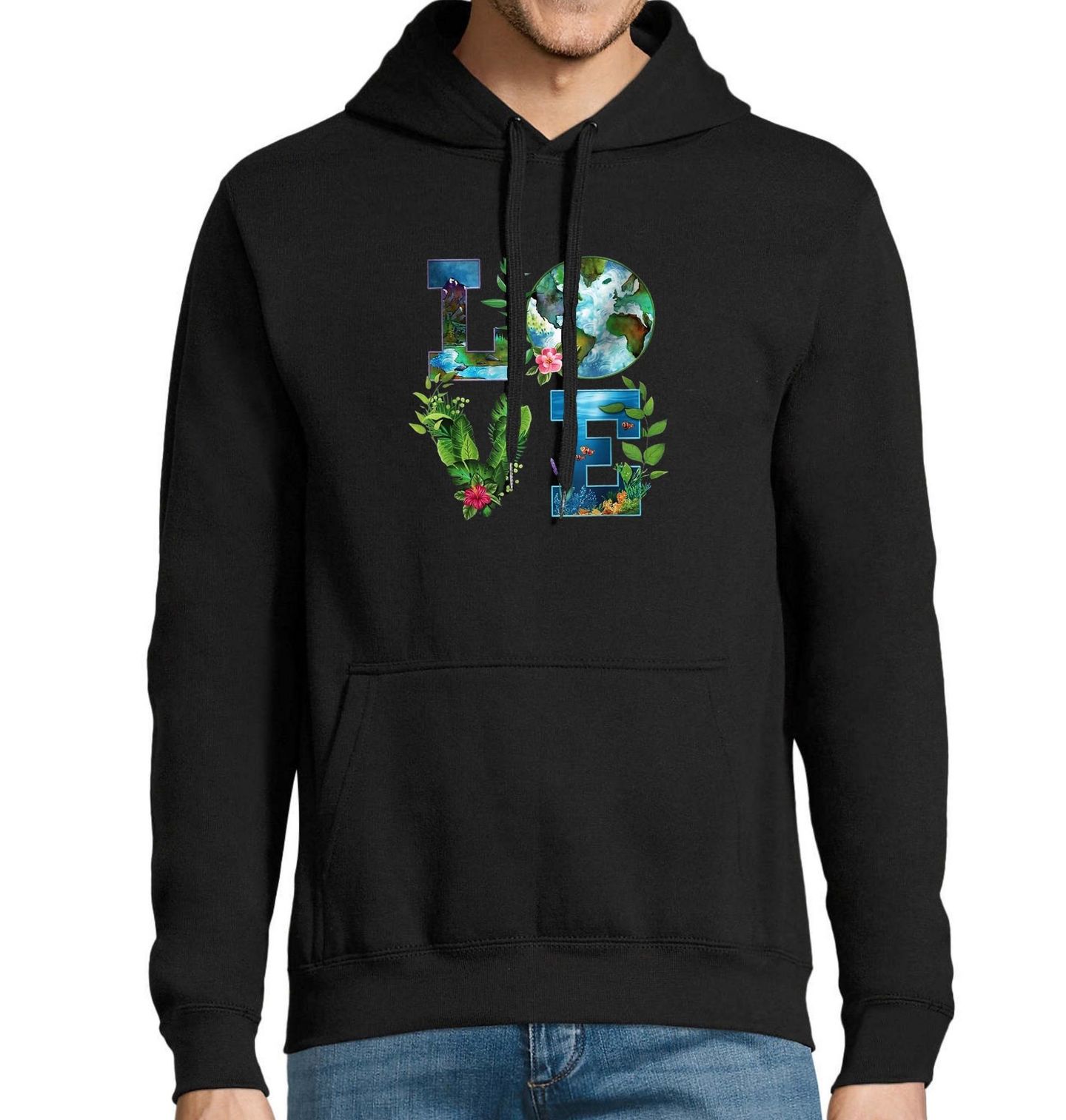 Pánská mikina Láska k Oceánu LOVE. Nádherný motiv složený z písmen slova LOVE, který symbolizuje lásku k naší planetě. Každé písmeno je tvořeno jiným živlem nebo částí přírody – od hor a řek, přes Zemi samotnou, až po podmořský svět plný života. Spojení Země, oceánu a moře není jen vizuálně krásné, ale i výzvou k péči o naši planetu.