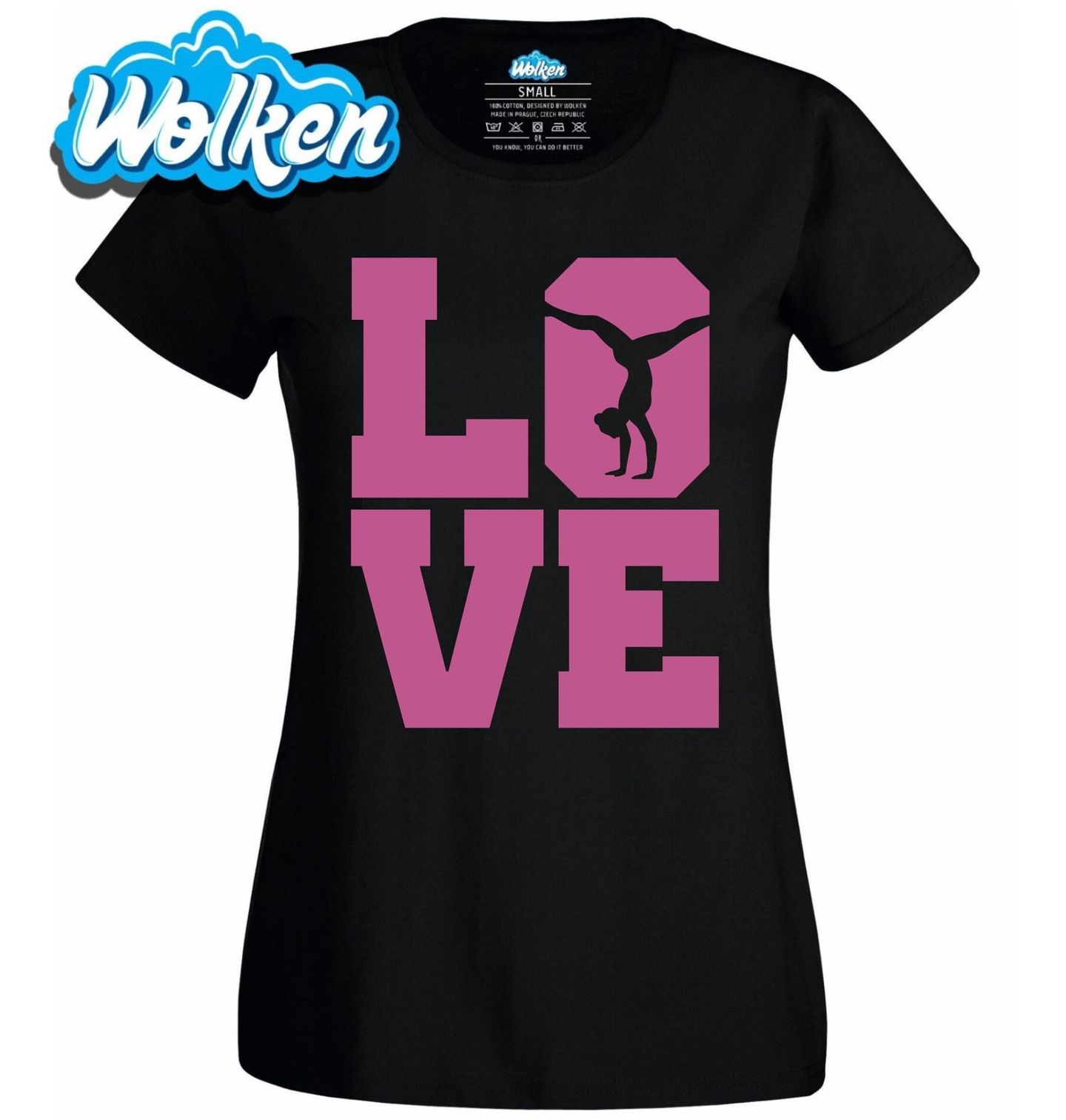 Dámské tričko Láska ke Gymnastice LOVE. Tento originální motiv vyjadřuje, že gymnastika není jen sport, ale opravdová láska. Silueta gymnastky zakomponovaná do nápisu LOVE symbolizuje eleganci, sílu a vášeň, kterou gymnastika v sobě nese. Ideální pro všechny gymnastky, trenérky i fanoušky, kteří chtějí ukázat, že jejich srdce patří pohybu, ladnosti a sportovní disciplíně.