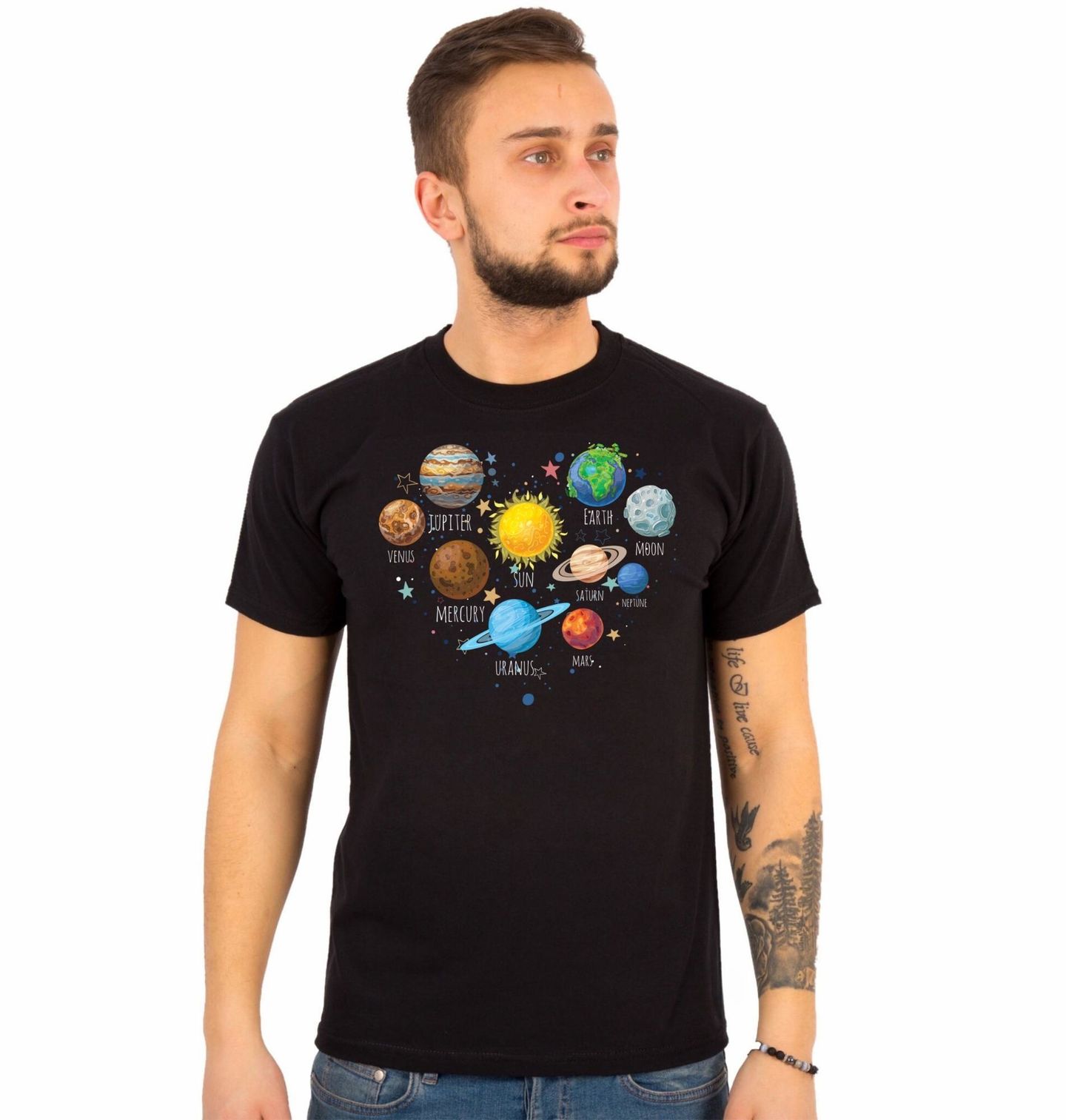 Pánské tričko Láska ke Sluneční soustavě. Originální motiv sluneční soustavy uspořádaný do tvaru srdce. Design zobrazuje planety Merkur, Venuše, Země, Mars, Jupiter, Saturn, Uran a Neptun, doplněné o Slunce uprostřed a Měsíc. Ideální pro všechny, kdo milují vesmír, planety a originální design.