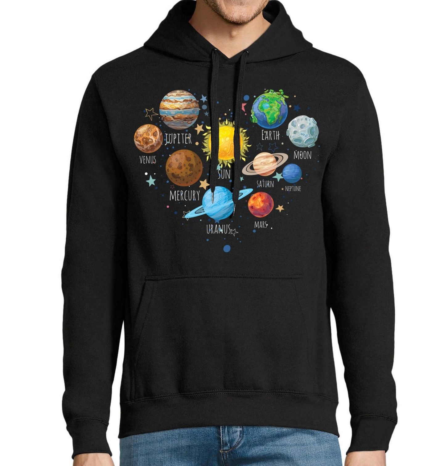Pánská mikina Láska ke Sluneční soustavě. Originální motiv sluneční soustavy uspořádaný do tvaru srdce. Design zobrazuje planety Merkur, Venuše, Země, Mars, Jupiter, Saturn, Uran a Neptun, doplněné o Slunce uprostřed a Měsíc. Ideální pro všechny, kdo milují vesmír, planety a originální design.